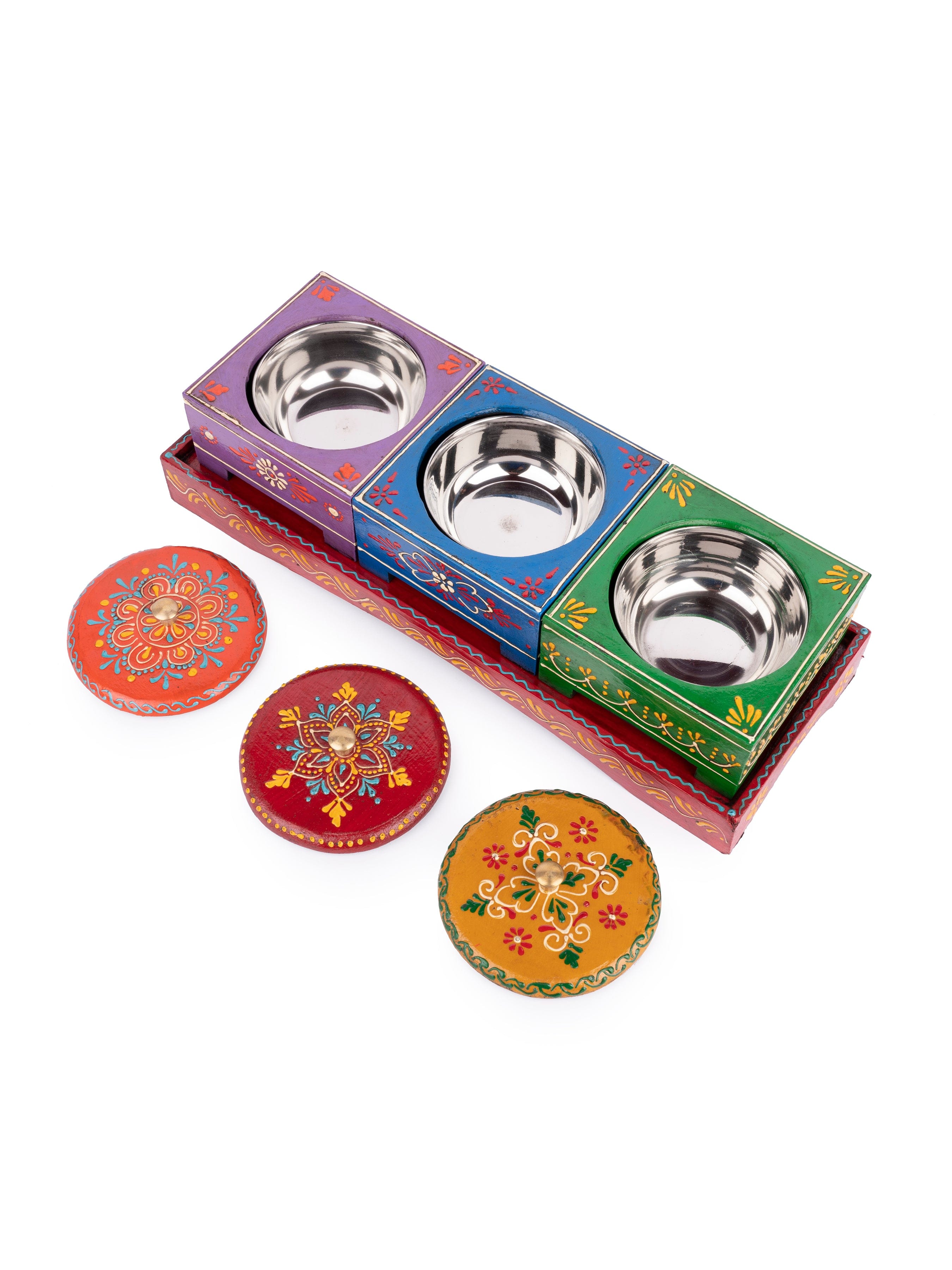This beautifully designed handmade dry fruit box will give a hike of tradition to your living and lounge area. This rectangular-shaped box has 3 compartments to keep dry fruits, cookies, candies, and other tidbits. Each compartment has a lid to cover when not in use. Made of strong MDF wood and hand-painted and decorated by traditional artisans of Rajasthan.
