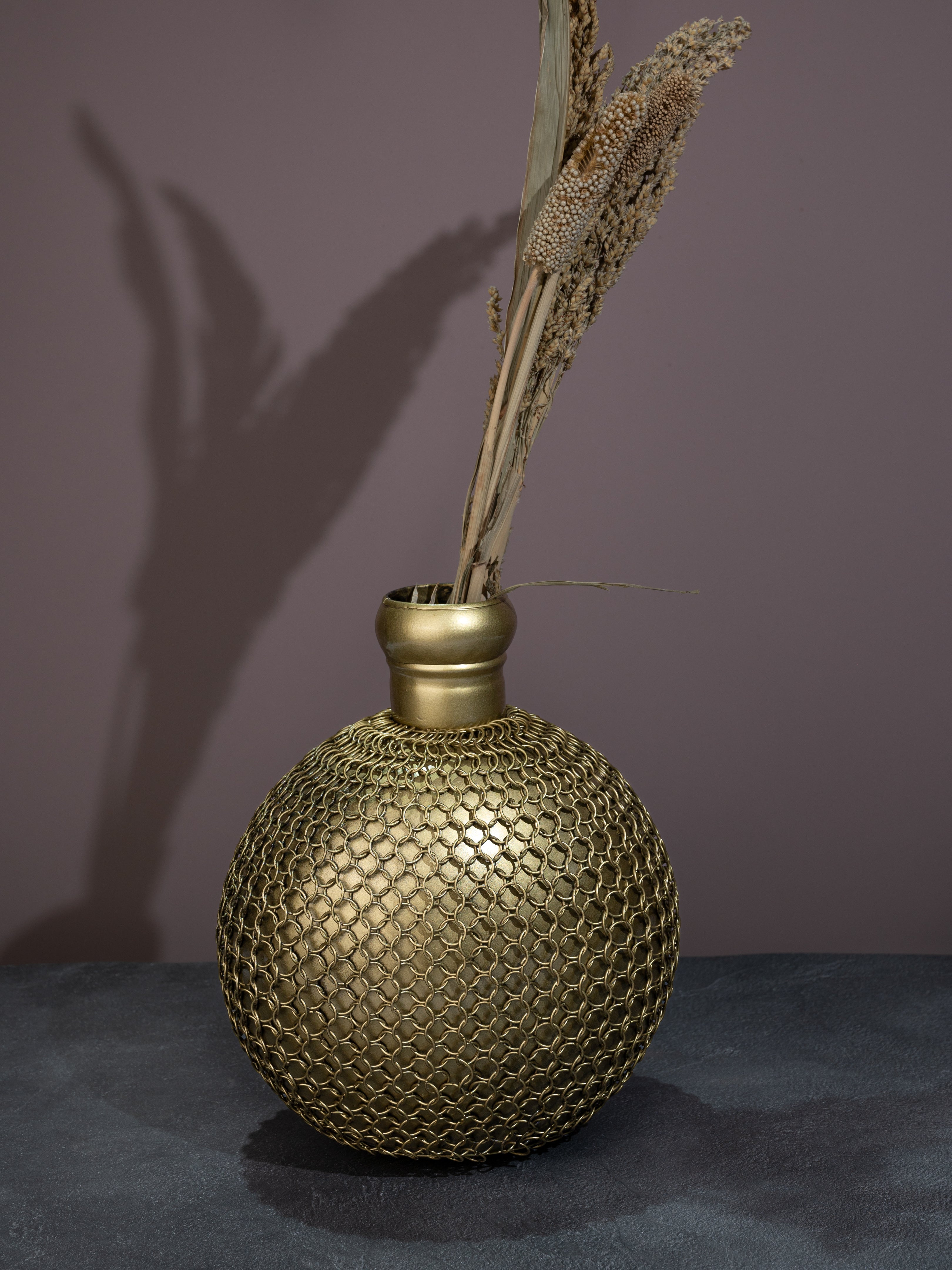 Smart and stylish, our gold colored vase with a sleek pattern is an instant crowd pleaser. Intricately crafted from metal and covered with chain mesh, you can use this vase as an exclusive decor piece or showcase your favourite botanicals in style.