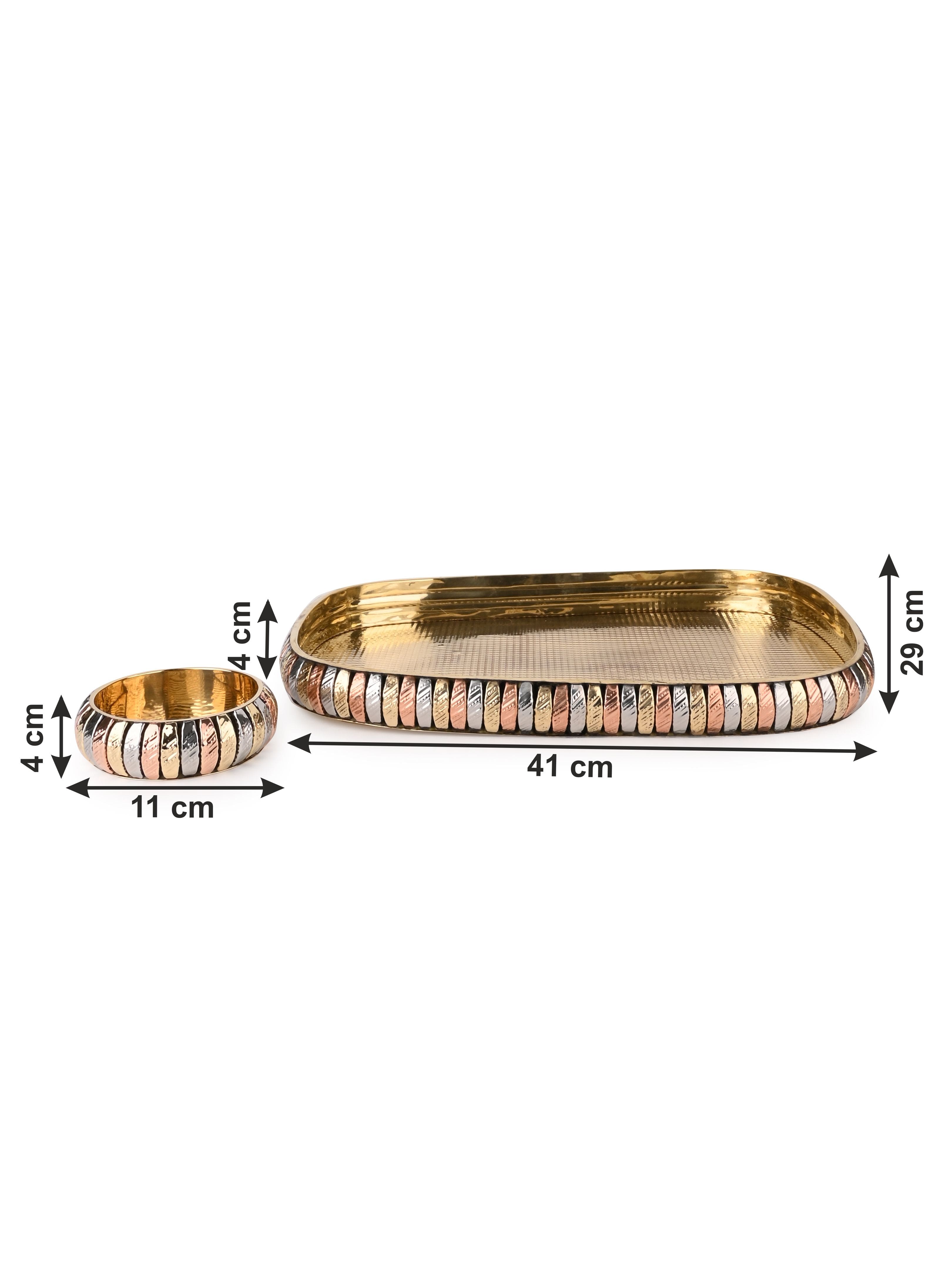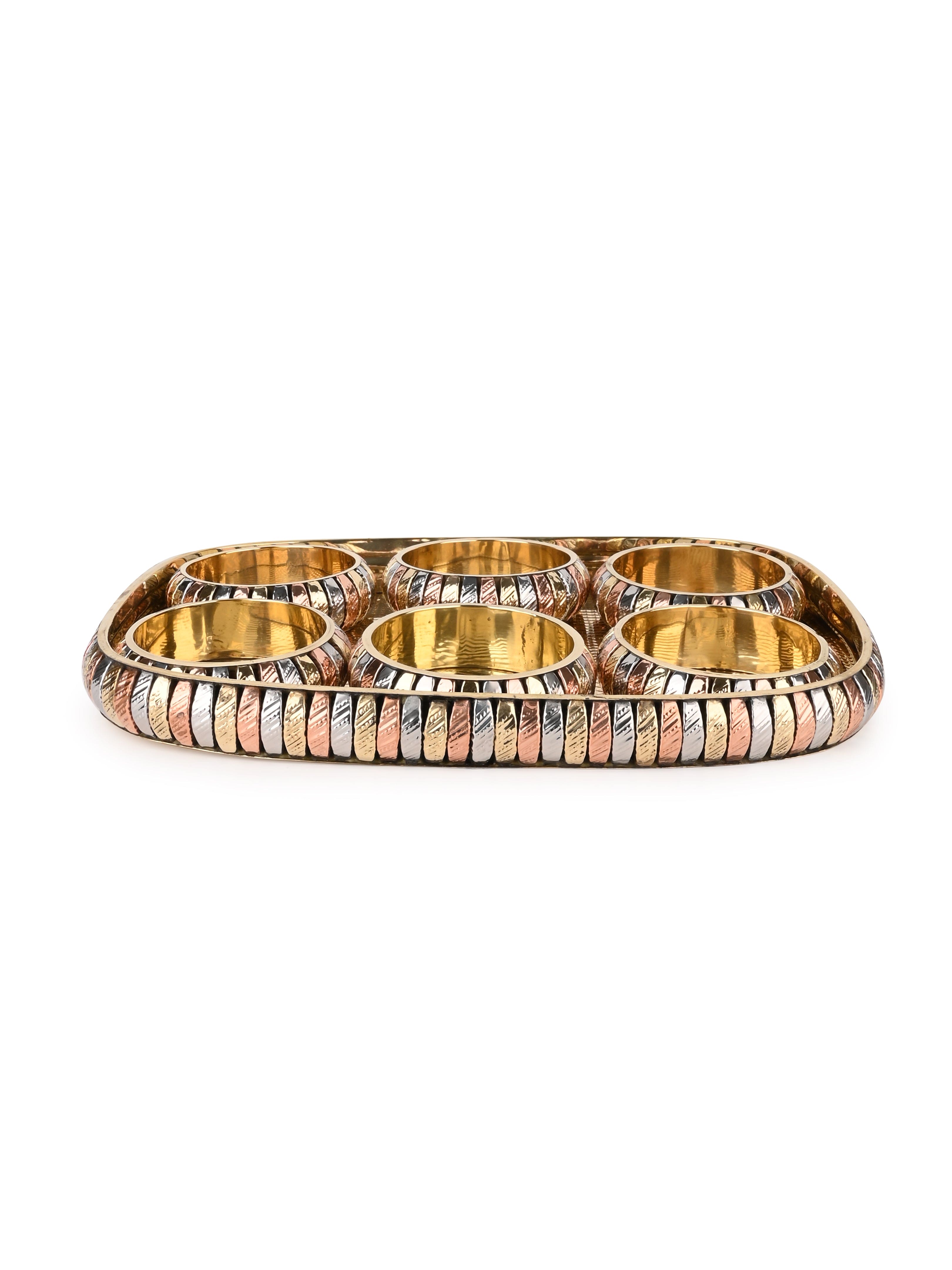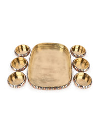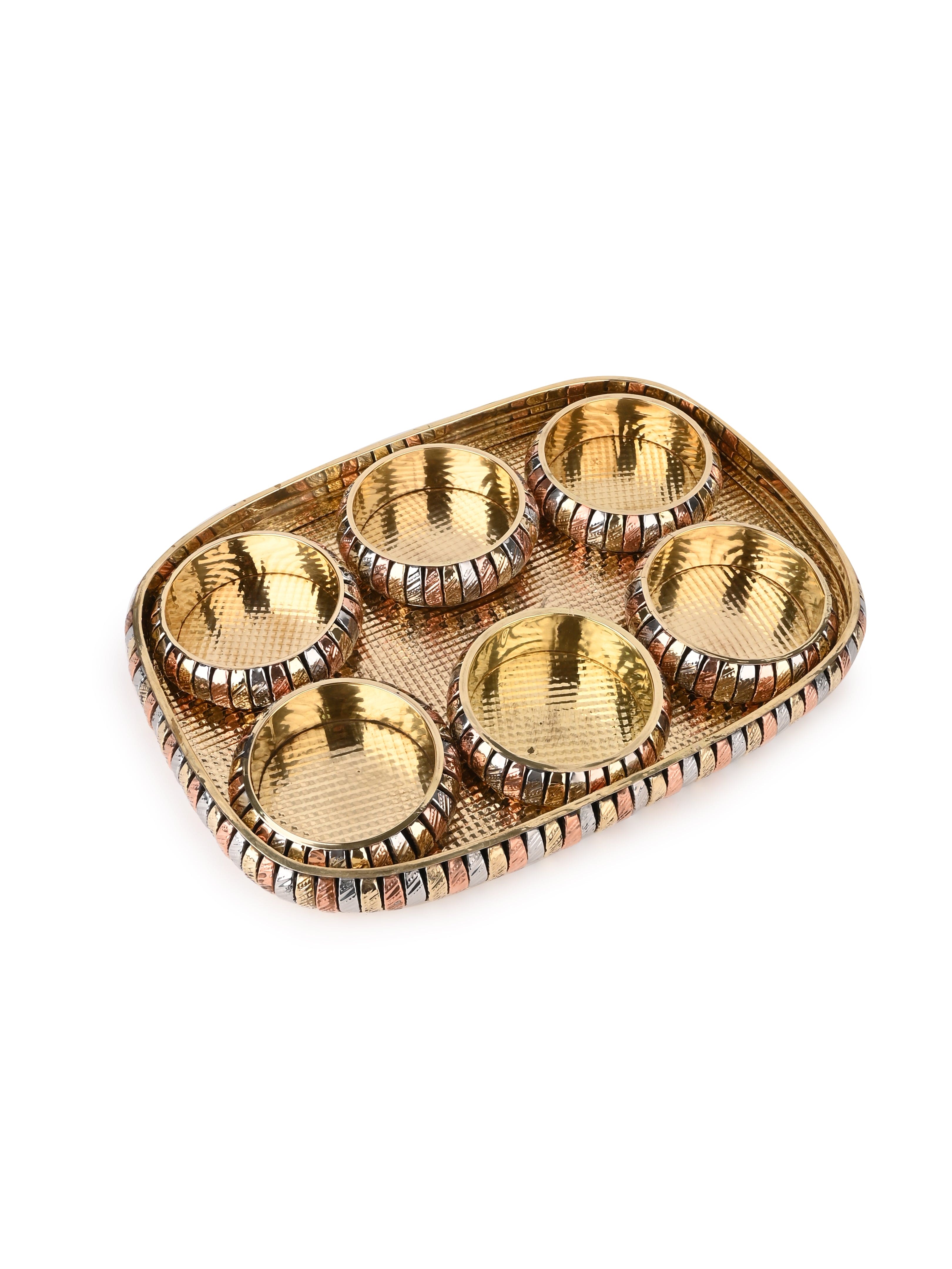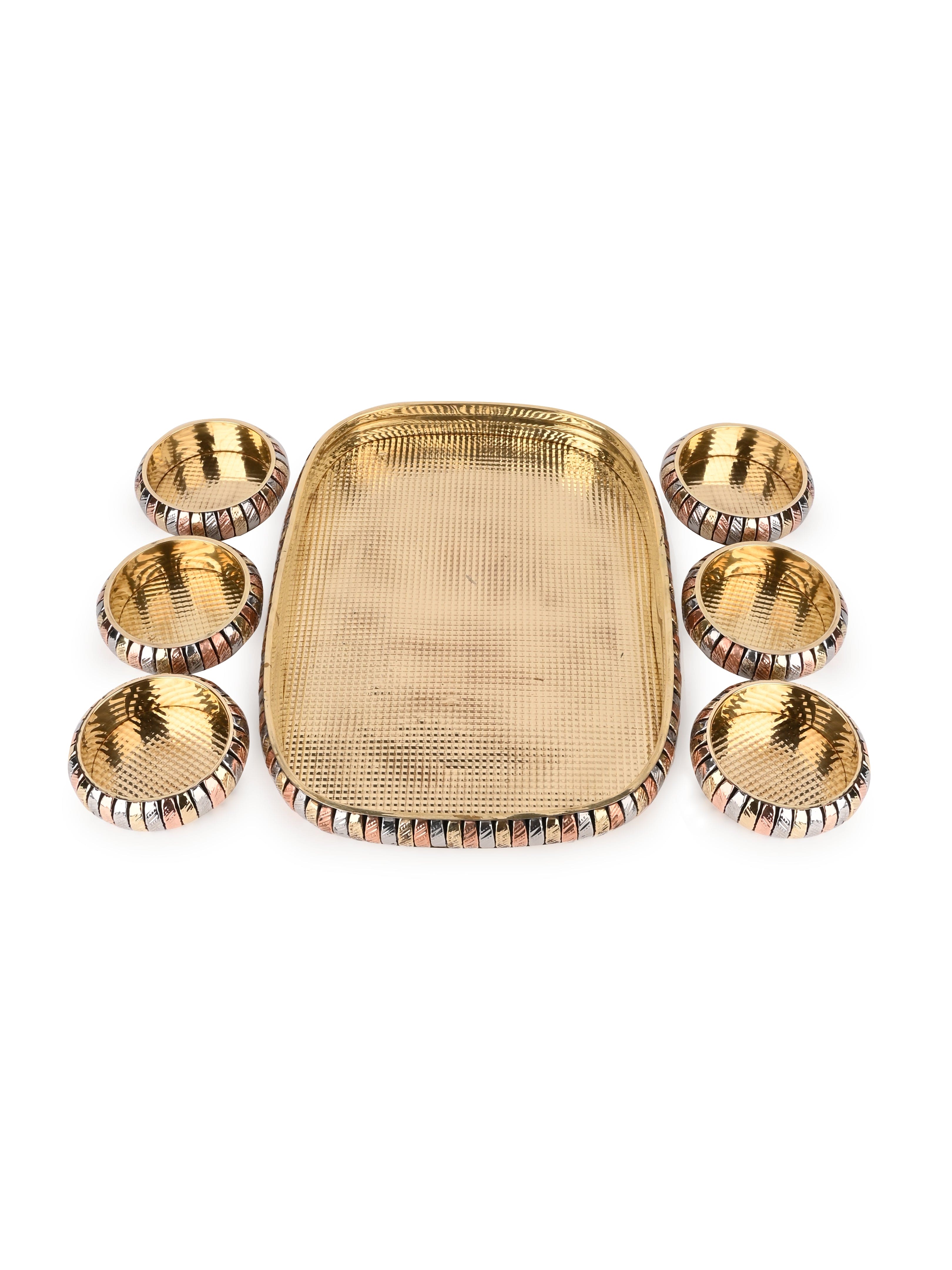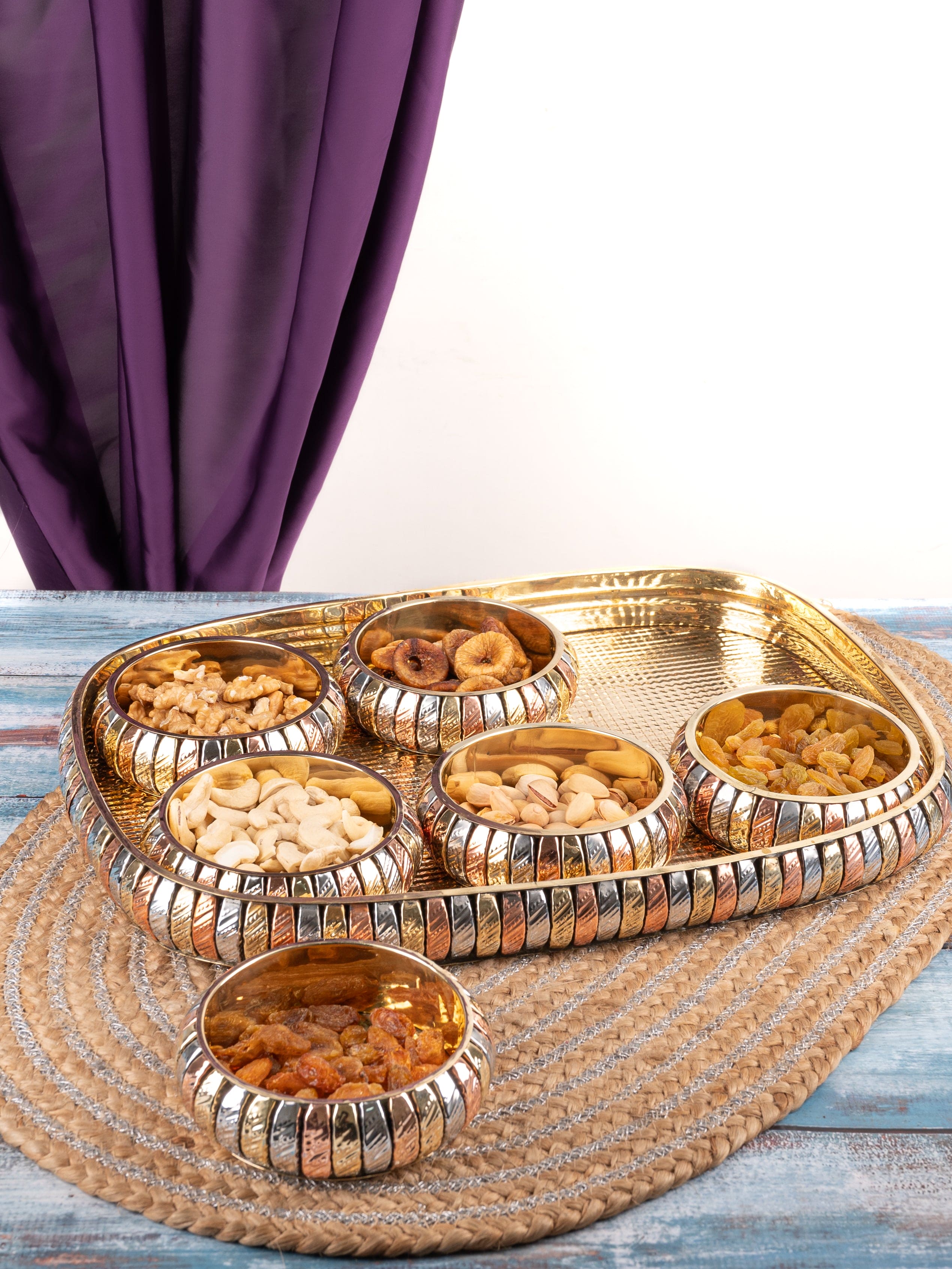 We present this beautiful set of tray and six bowls that comes in brass and copper finish to bring elegance to your dining table with its excellent visual appeal. It is mainly used for dry fruits but you can use it as a multi purpose storage unit also. Don't by shy to flaunt the set in front of your guests.