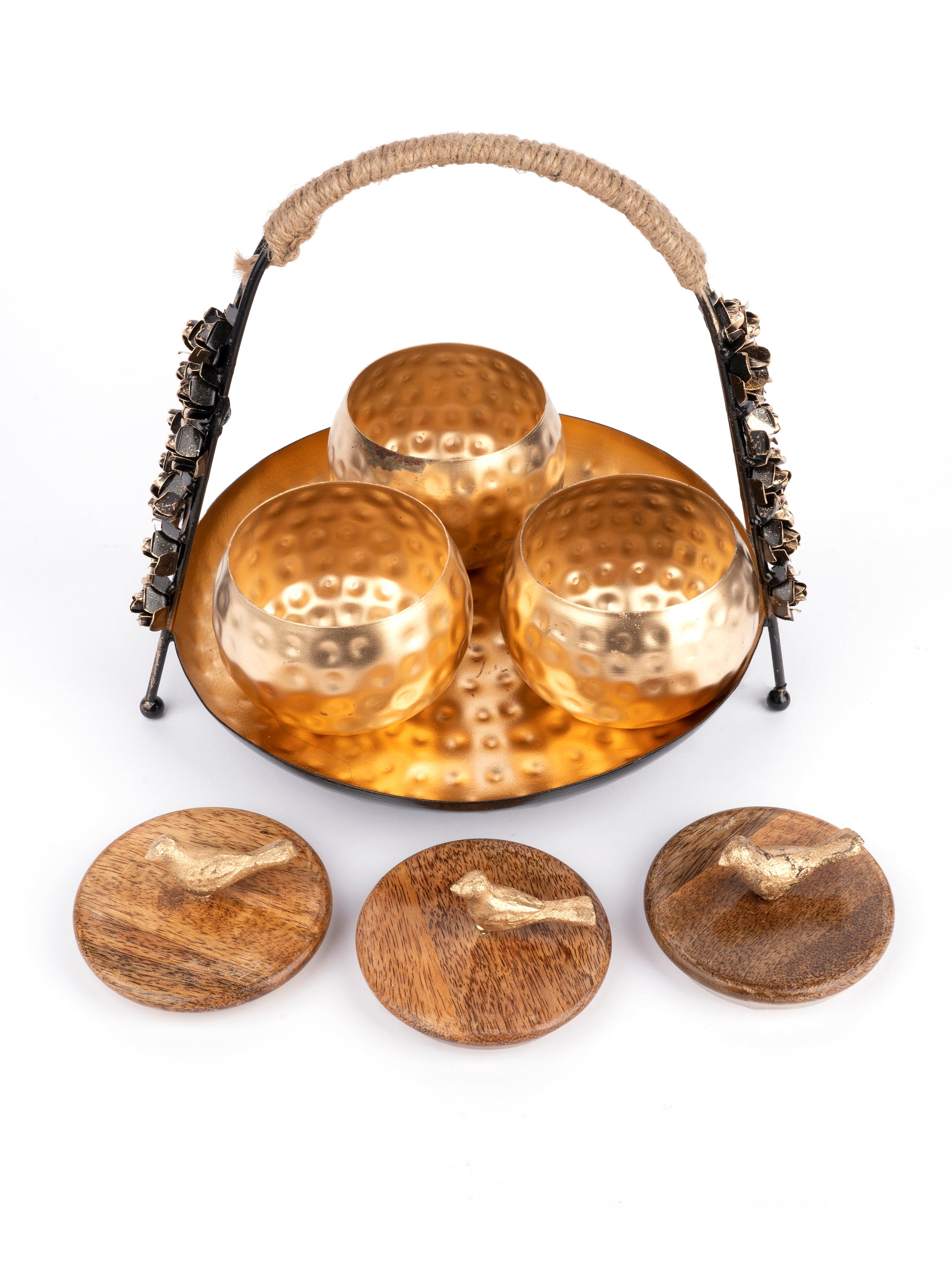 The refined metal canister set here is to organize your tea, coffee, sugar, spices, dry fruits etc. into one place and prevent your dining area from becoming a mess. The set contains 3 jars which symbolize royalty from every visible angle. The exquisite wooden lids and bird shaped handles for each of the 3 jars held together in a basket or tray which has roses design on the handles. All these minute details add up to make a perfect Jar Set for your dining area.
