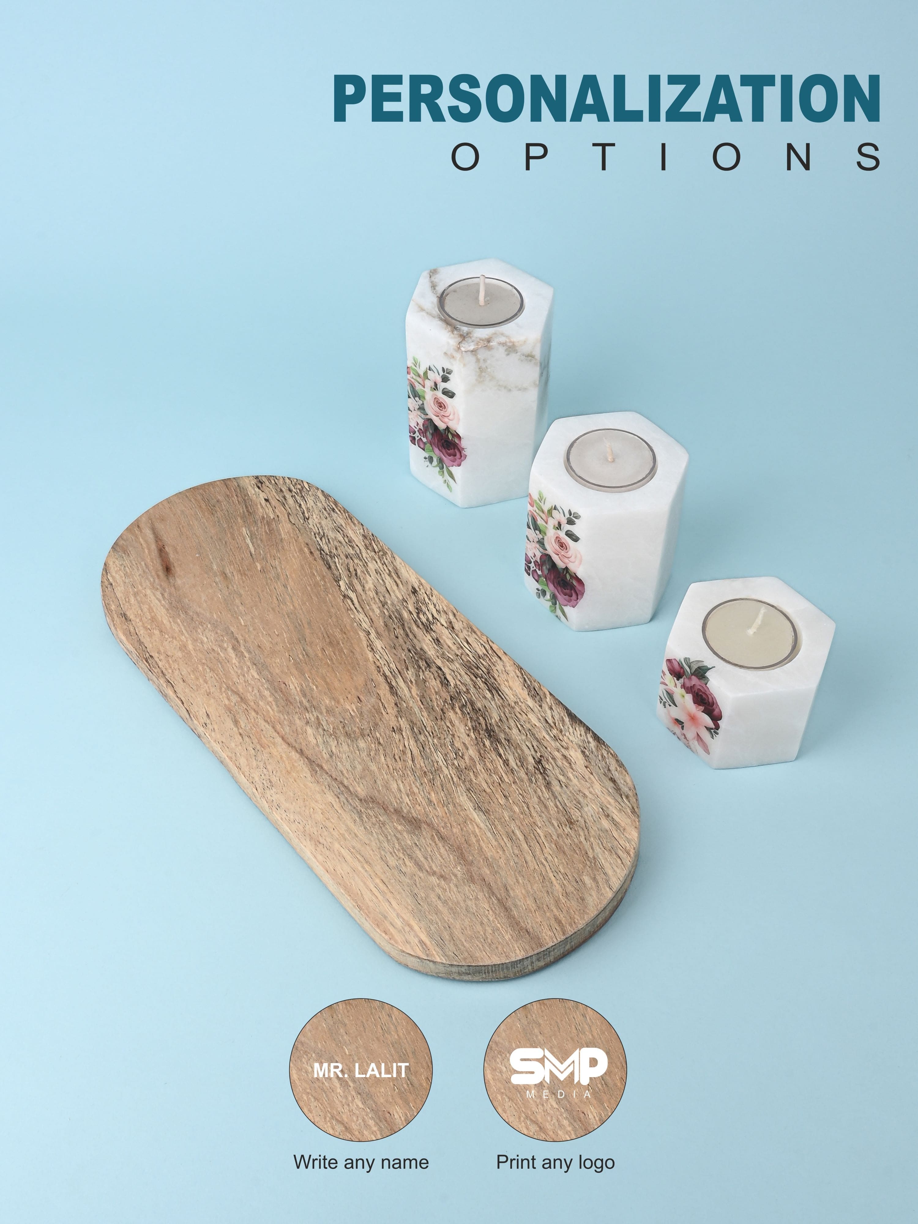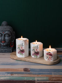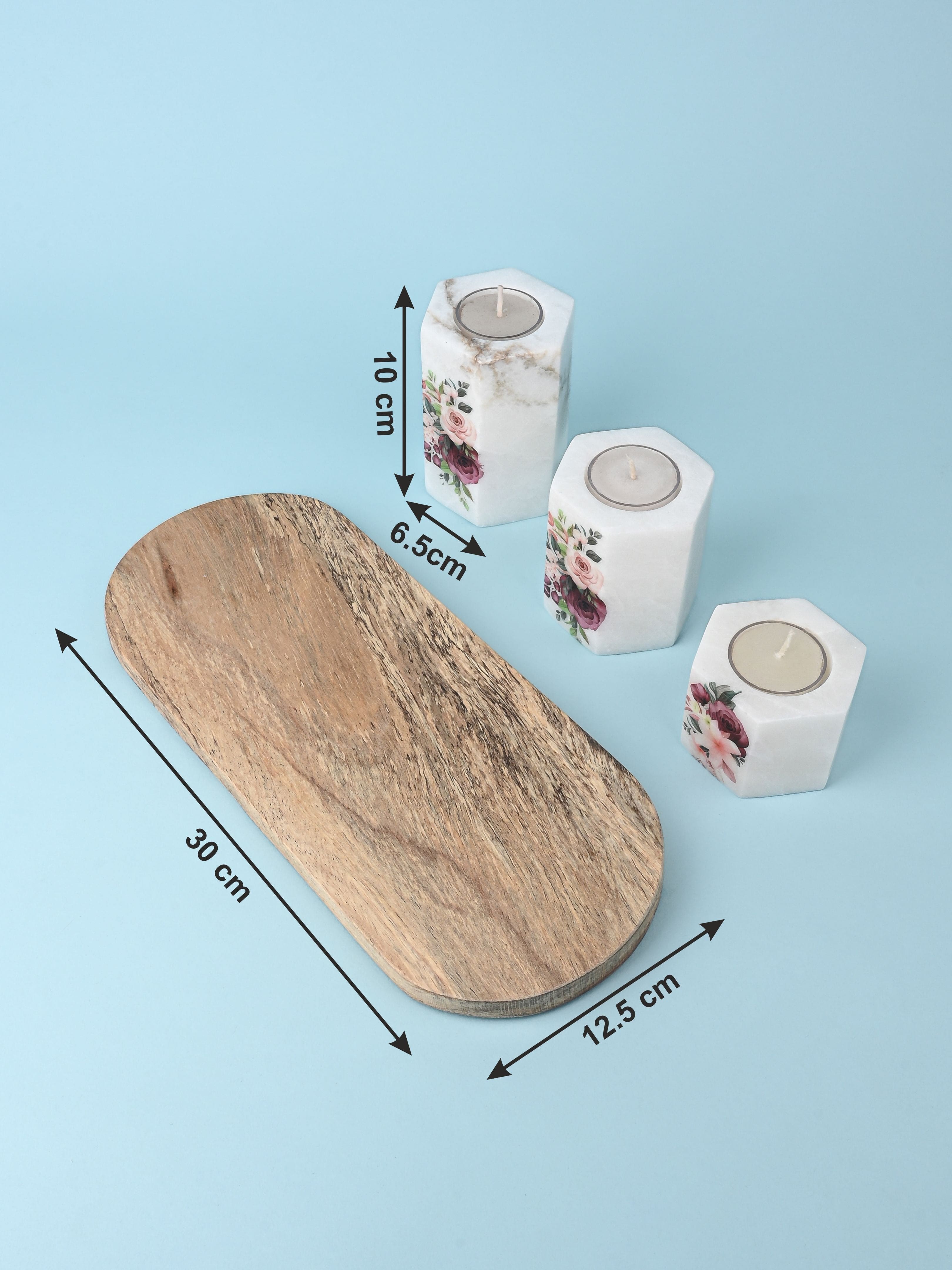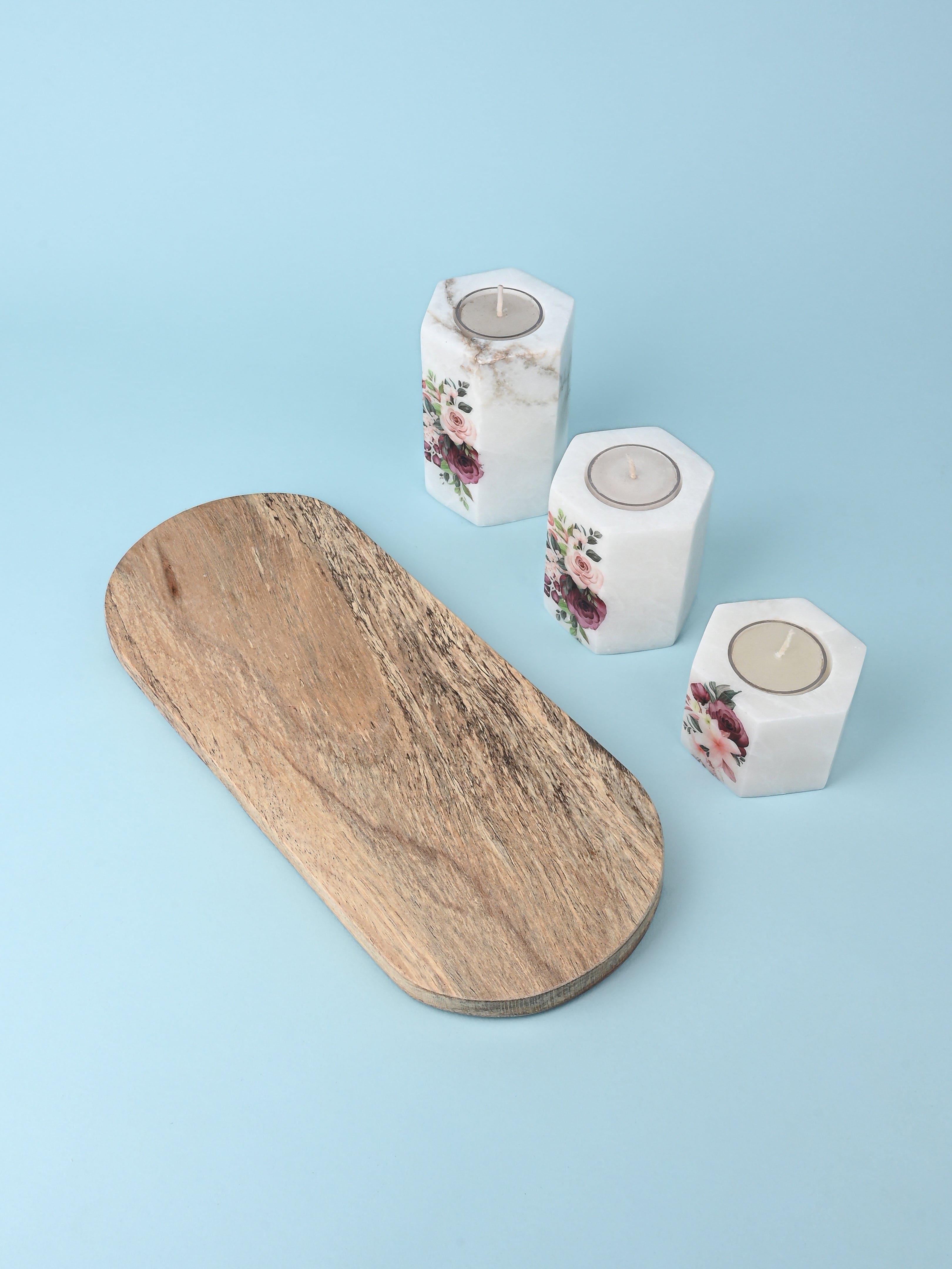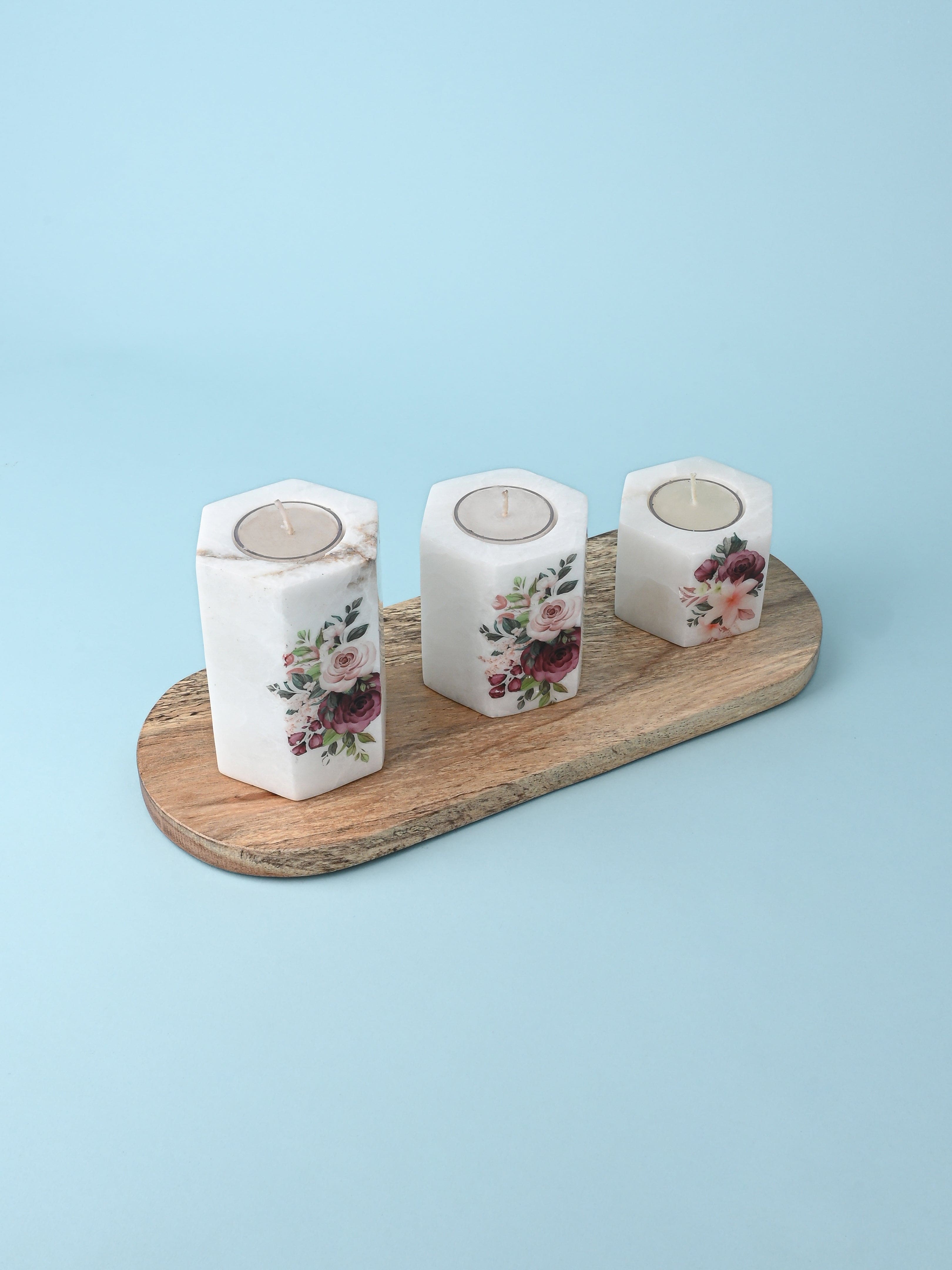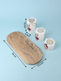 Set of 3 pcs Tea Light Candle Holder on a Wooden Plate - White Printed