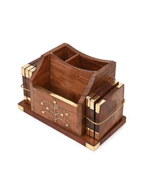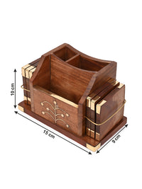 Introducing an exquisite enhancement to your dining experience – cutlery holder with 6 coasters. This sophisticated organizer is designed to elevate your dining table aesthetics while providing practical functionality. This holder provides an elegant way to store your cutlery, napkins, and tissues within arm’s reach.