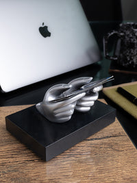 Elevate your professional image with our stylish pair of hands business card holder. Made of solid metal mounted on a wooden base, this classy holder makes a lasting impression on your visitors. Perfect for any office desk, the holders come in 3 different colors and you can choose the one that matches your office ambience.