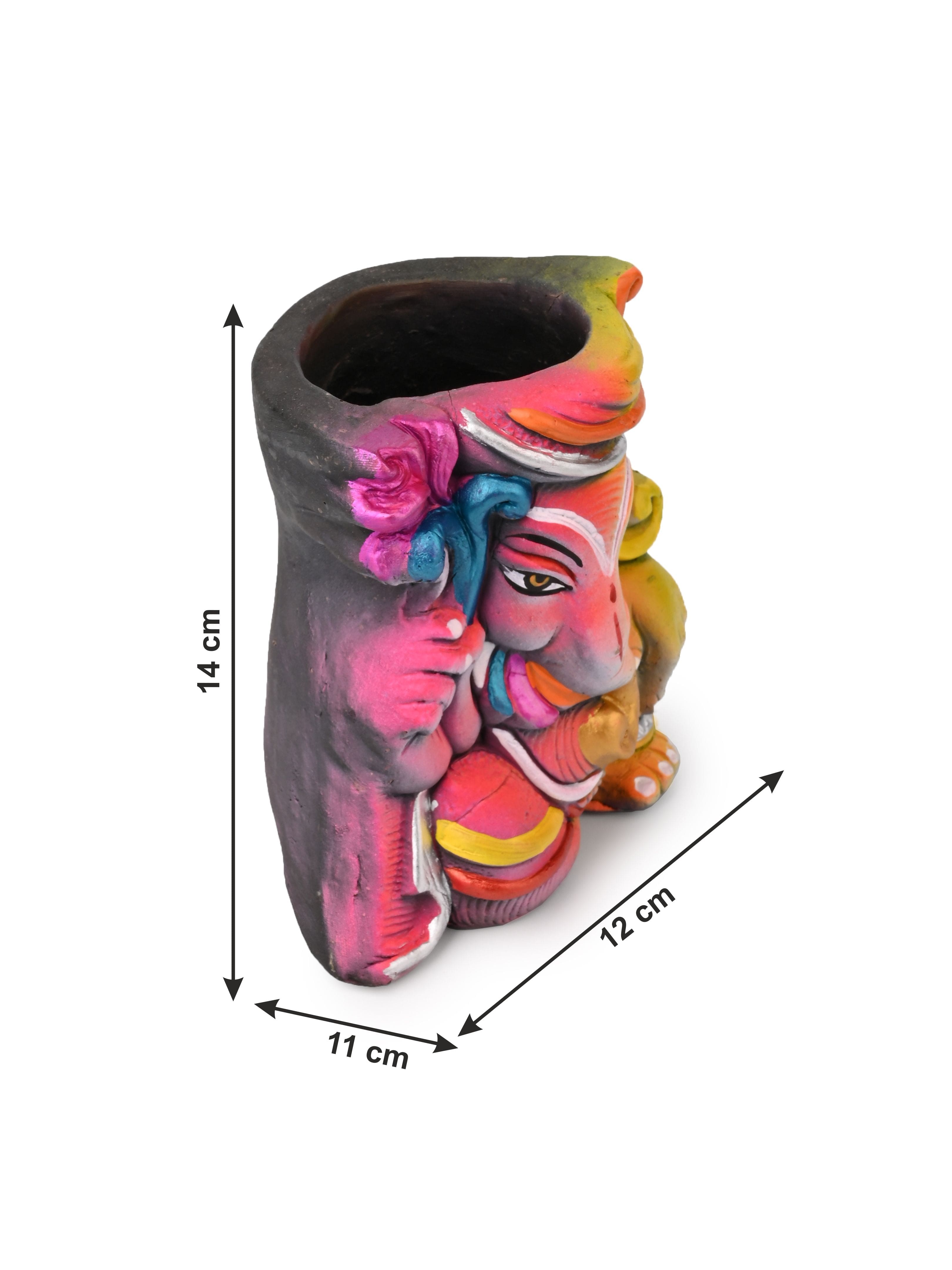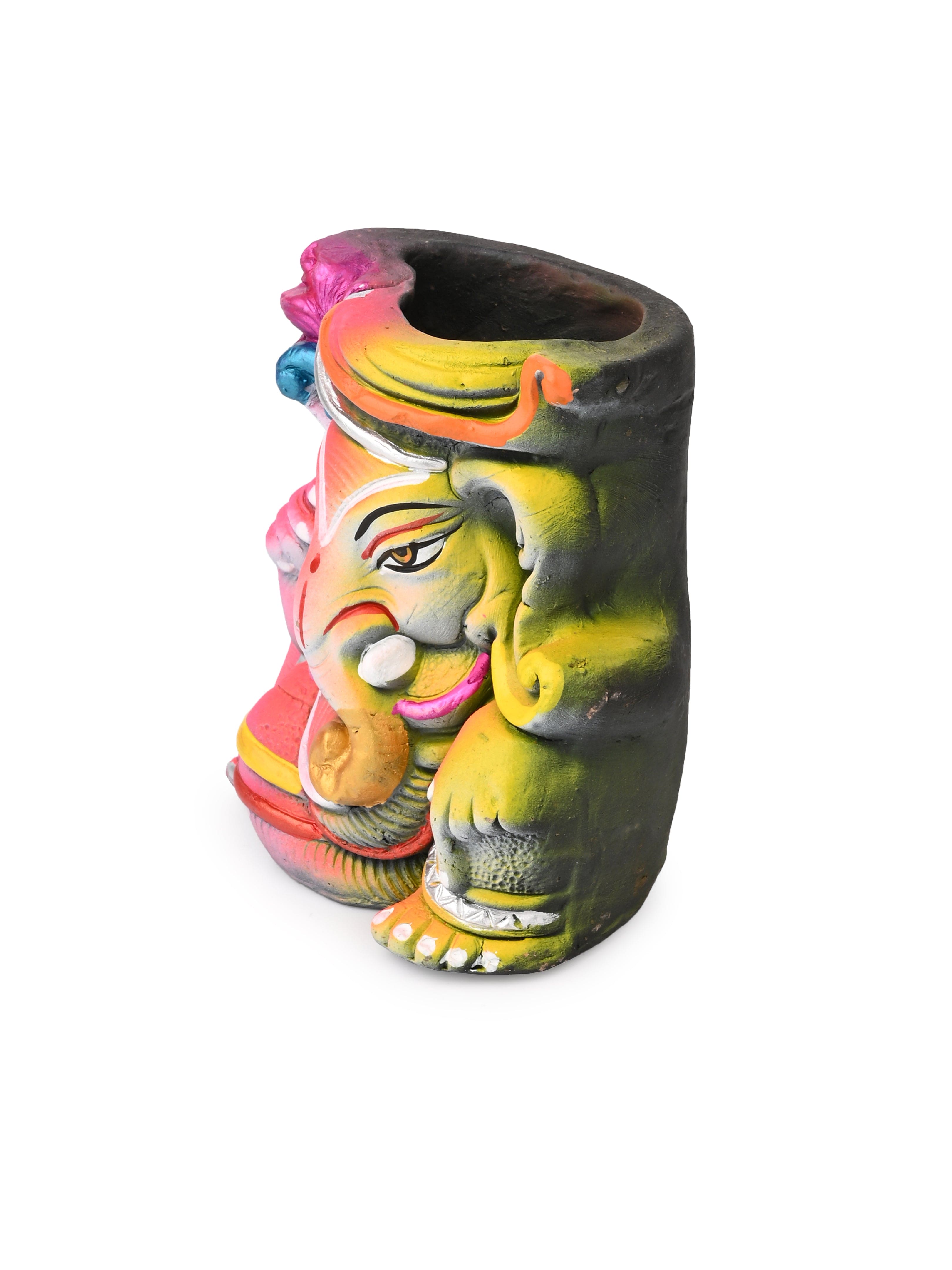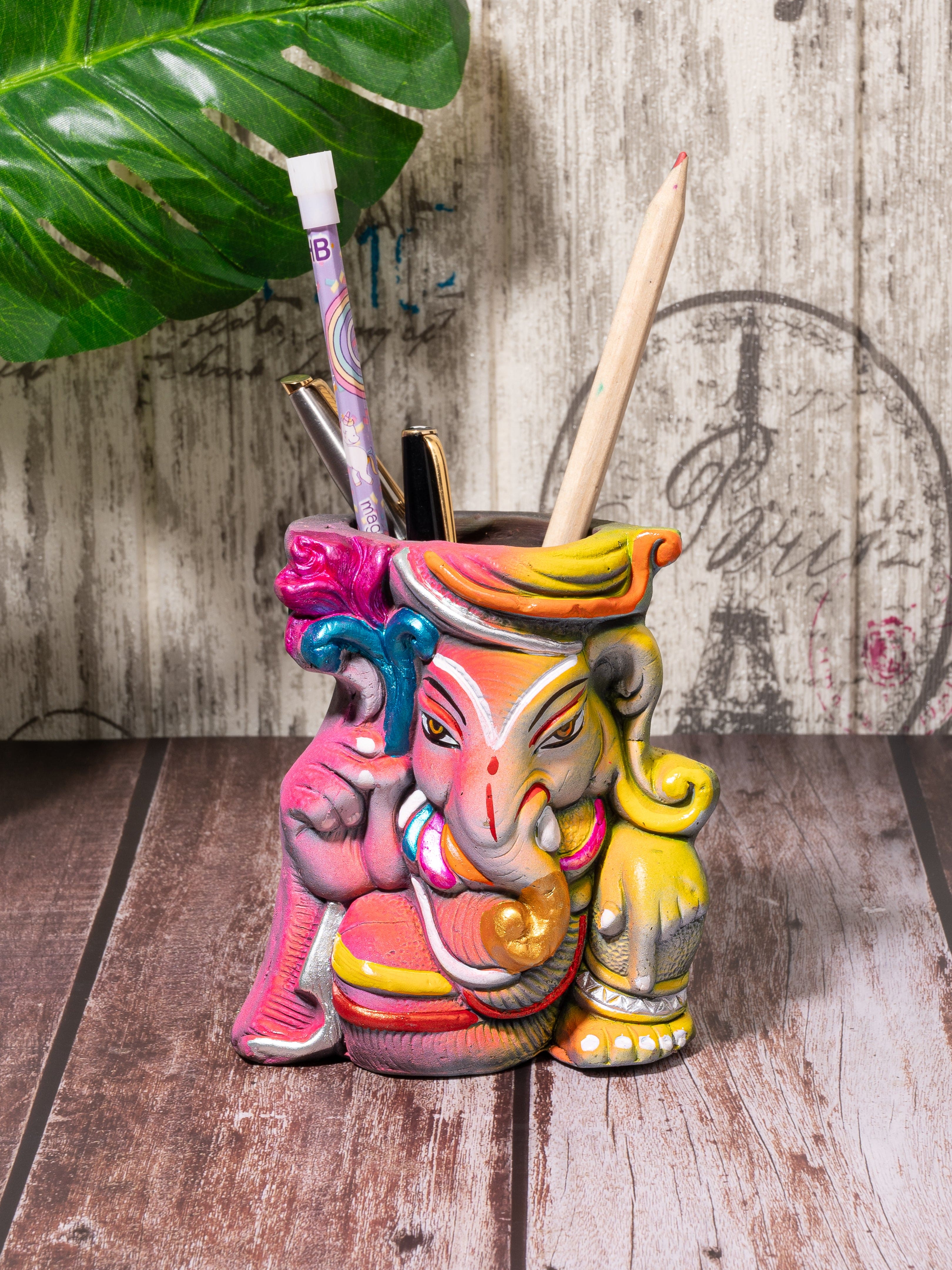 Our colorful terracotta Ganesha idol pen holder captures ancient Indian culture in a convenient modern art. The terracotta material and intricate hand painted Ganesha design create a unique look that adds a stylish flair to any workspace.