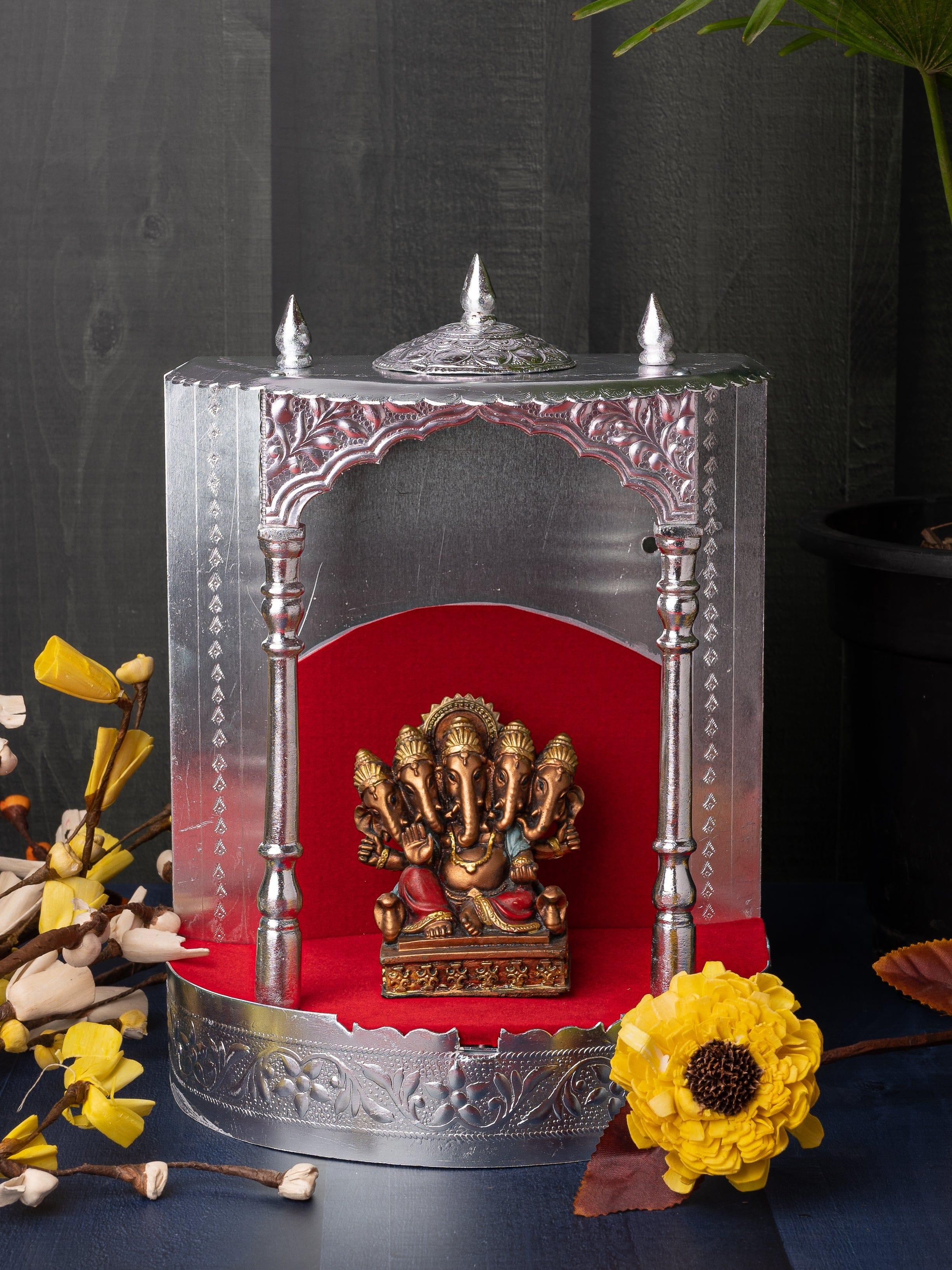 Buy our wall mounted Puja Mandir hand crafted of aluminium sheet by Rajasthani artisans. Skillfully crafted designs along with strong strokes and intricate carvings this temple will spread positive vibes in every corner of your home. You can arrange your favorite deity in the most convenient way to give an eye captivating and devotional look to your puja room.