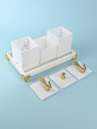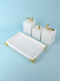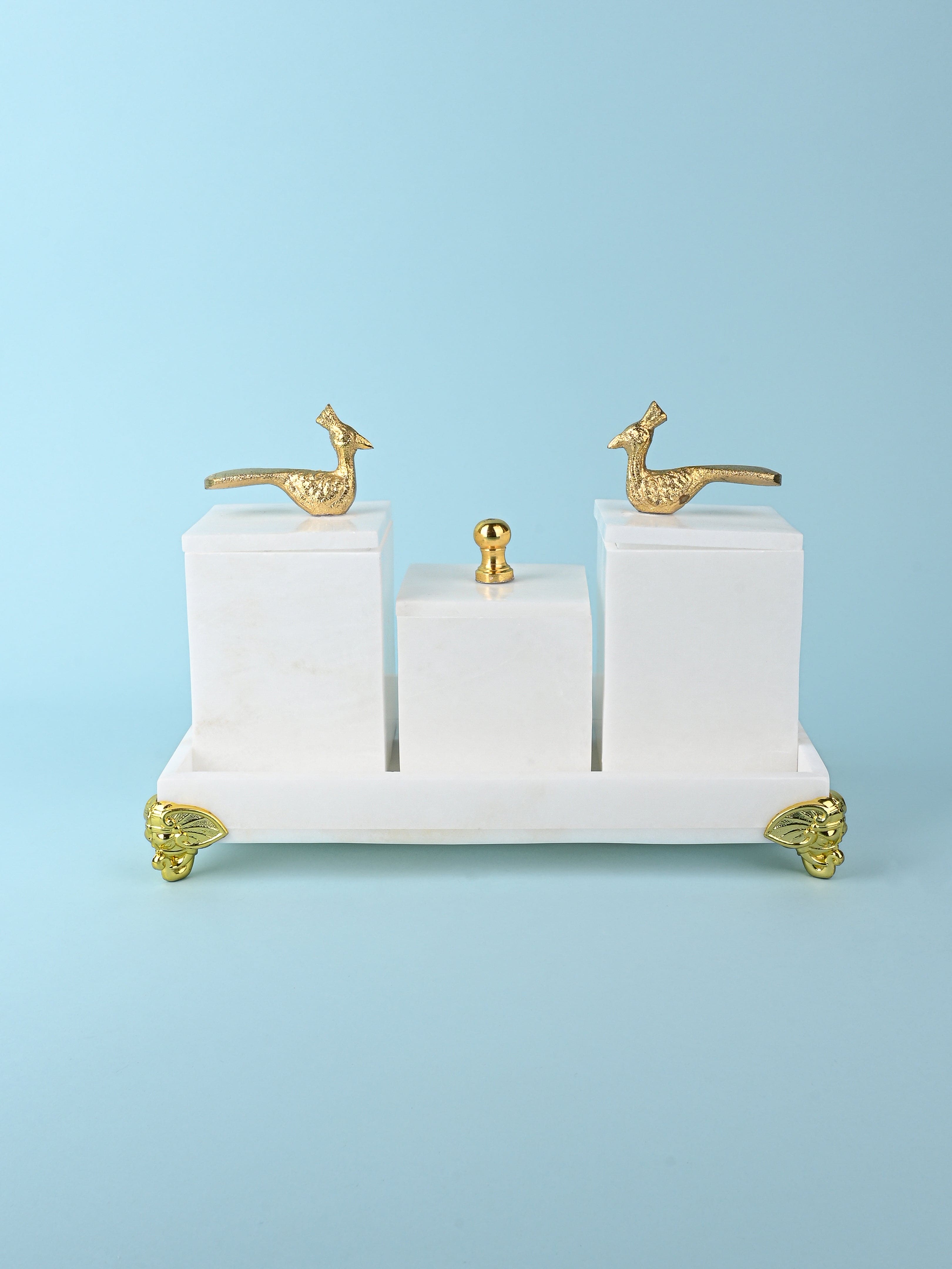 This charming 3 pieces white jar set on a tray is carefully hand crafted in marble with great finish and can make a beautiful and practical gift for weddings, birthdays, or other special occasions. It can be filled with treats, small gifts, or keepsakes for a personalised touch.
