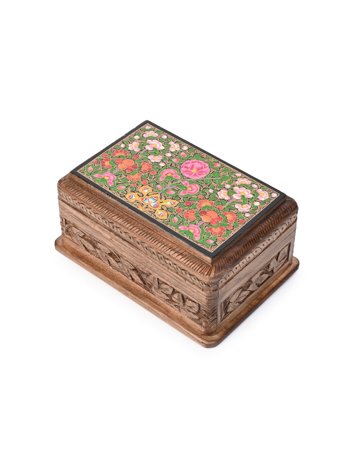 Walnut Wood Carved Secret Lock Storage Box with Paper Mache Design on Top - 6 inches