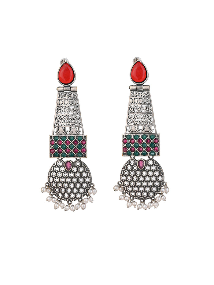 MAURYANA - Oxidised silver with red stone design pair of earrings - 4 inches