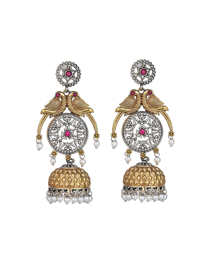 MAURYANA - Oxidised silver yellow color jhumka earrings pair with red stone - 4 inches