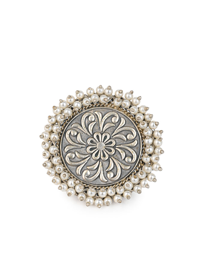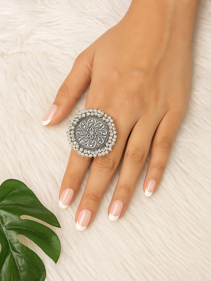 MAURYANA - Oxidised silver finger ring with white beaded border - adjustable size