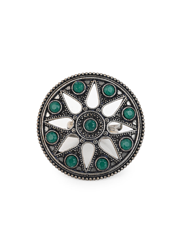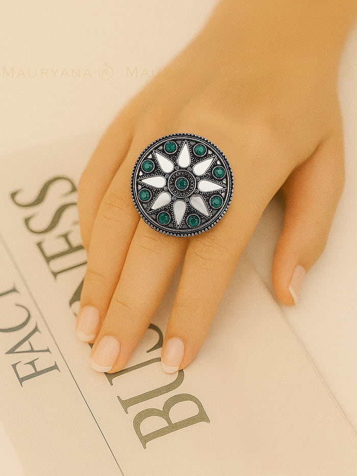 MAURYANA - Oxidised silver round big ring in assorted color stones - adjustable size