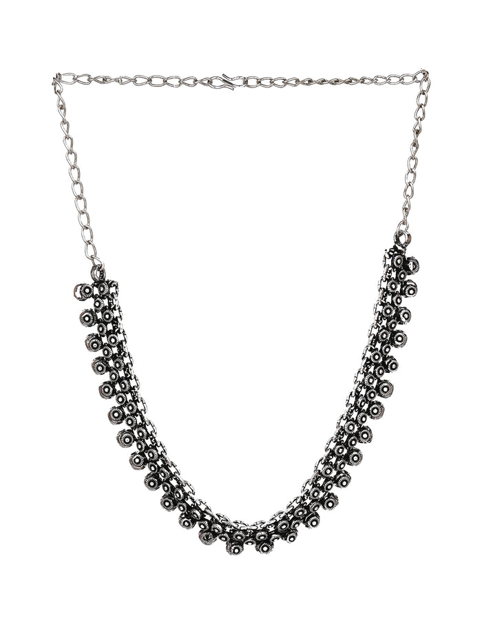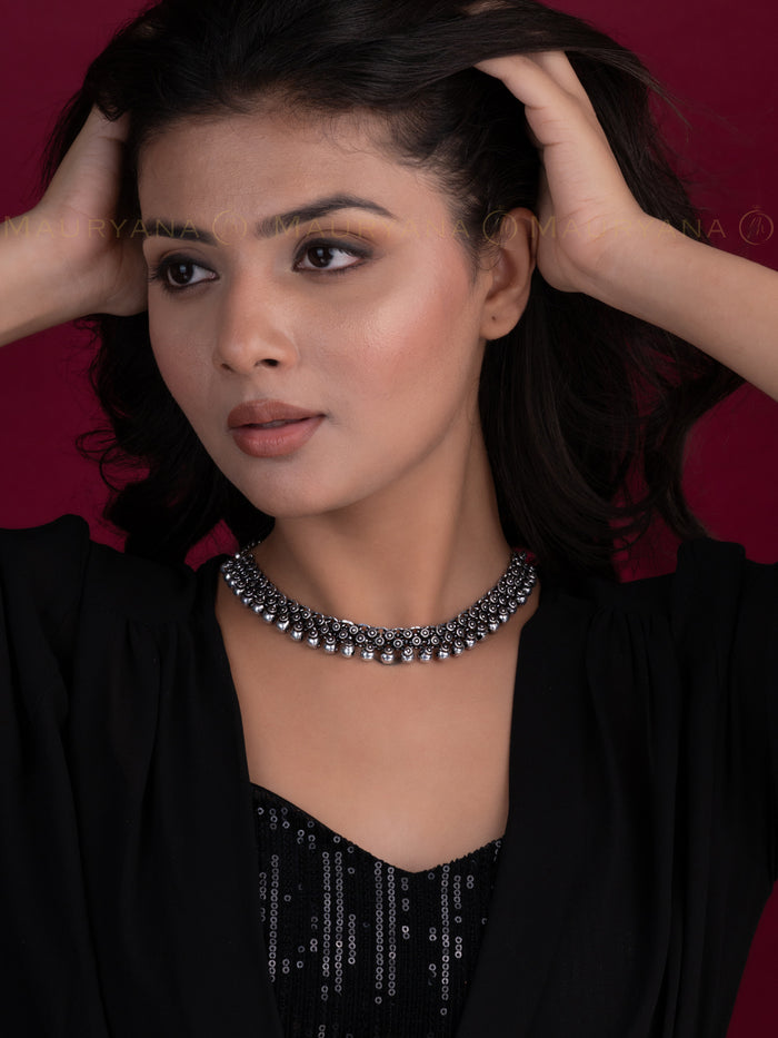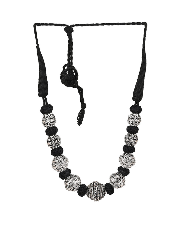 MAURYANA - Oxidised silver beaded necklace set with earrings - adjustable length