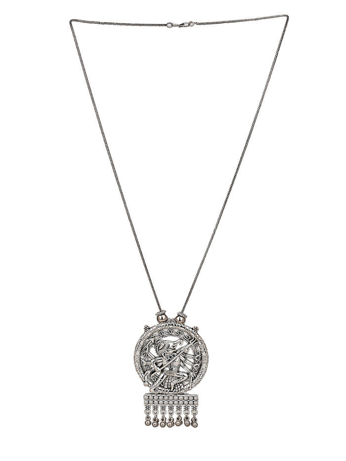 MAURYANA - Oxidised silver durga mata pendant necklace set with earrings - one size