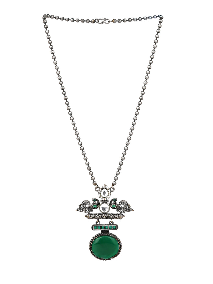 MAURYANA - Oxidised silver with green stone embellished necklace set with earrings - one size
