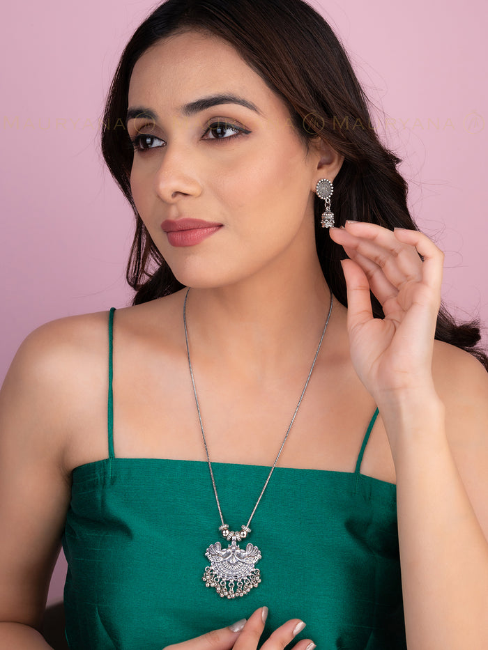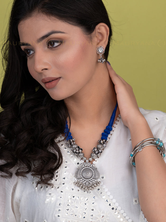 MAURYANA - Oxidised silver pendant necklace set with earrings - adjustable length