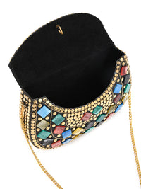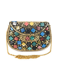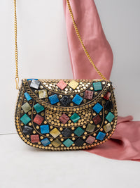 A masterpiece of craftsmanship and color — this brass clutch adorned with vibrant stones exudes luxury and charm. Perfect for evenings that call for a touch of sparkle and timeless elegance.
