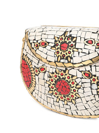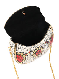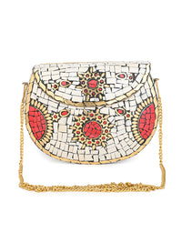 A masterpiece of elegance — this brass-crafted clutch adorned with white and red stones radiates royal charm and festive sophistication. Perfect for evenings that call for a touch of grandeur.