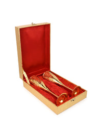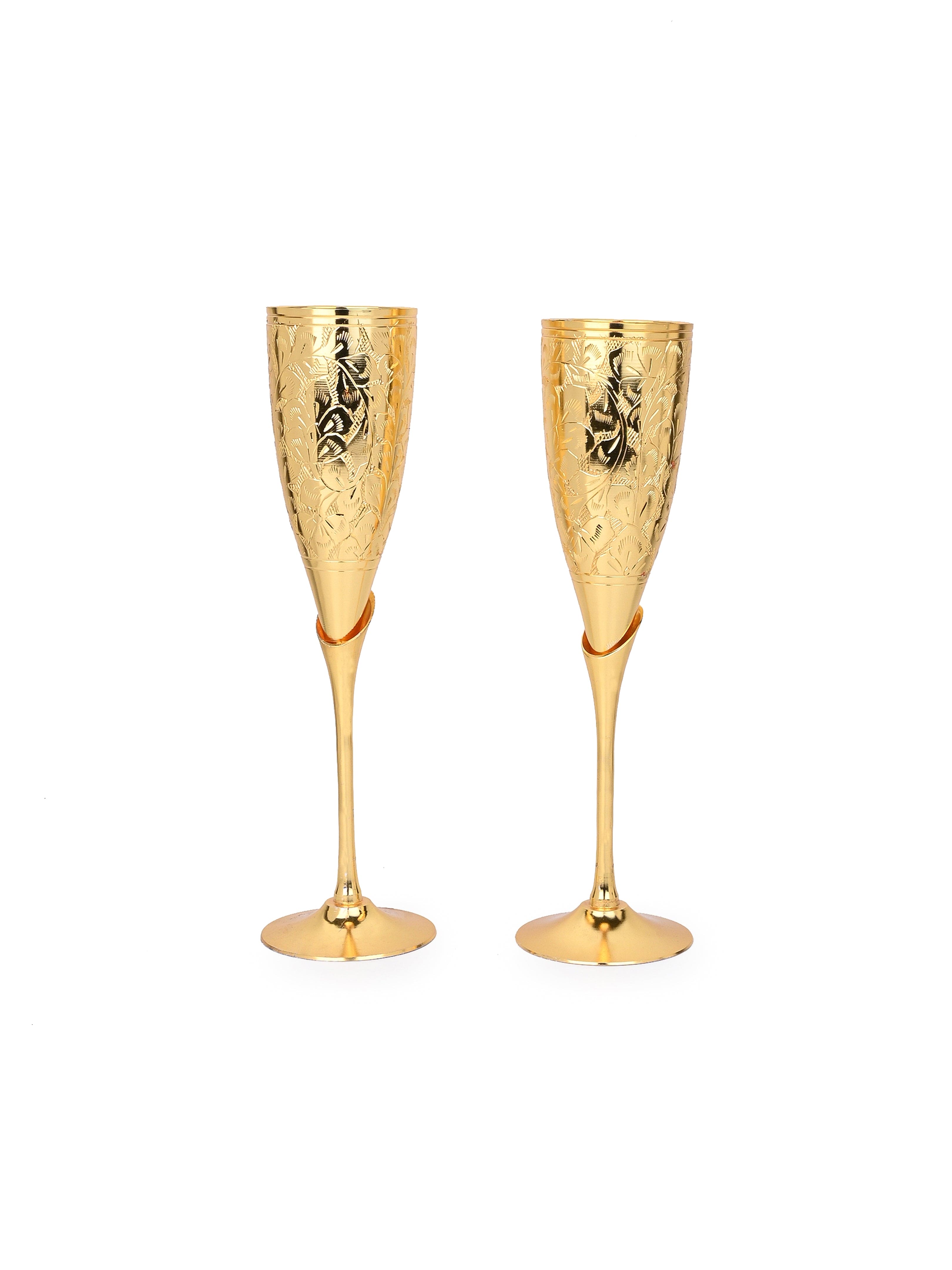 Begin your party with this unusual, exquisite flute set handcrafted from brass. These glasses can be used for serving wine, champagne, and other types of beverages, and can be a great addition to a collection of fine glassware. They can also be used as a decorative piece, showcasing on a bar cart, dining table, or living room, adding a touch of luxury and elegance to any space.