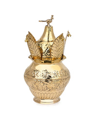 Brass crafted puja kalash with coconut and mango leaves - 10 inches