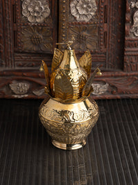 The enchanting Kalash figurine with coconut and mango leaves crafted from the finest quality of brass with meticulous attention to detail, this effervescent masterpiece captures the essence of the revered puja kalash, symbolizing abundance and spiritual purity. Use it for daily rituals or as a decor for your living and puja room.