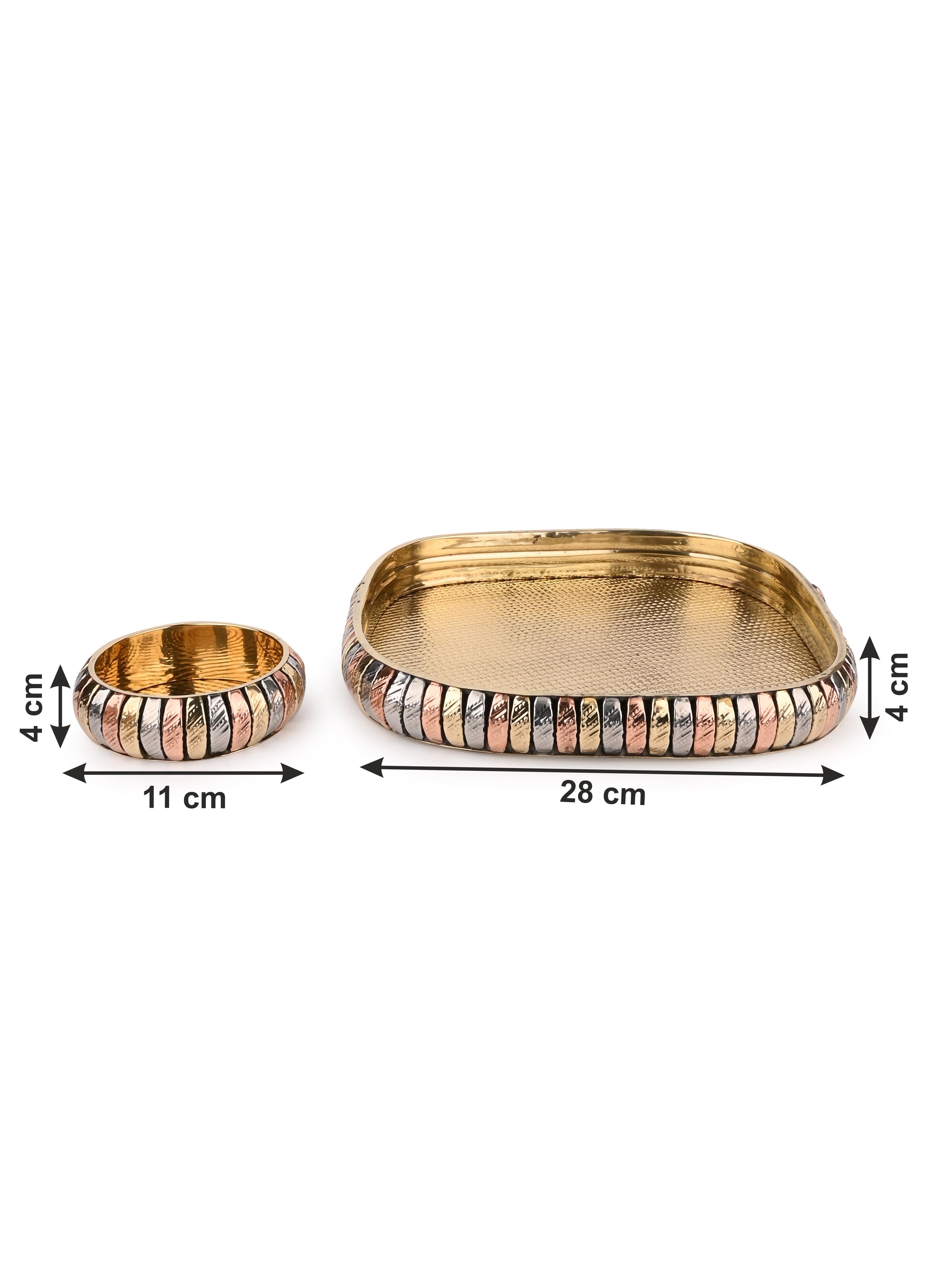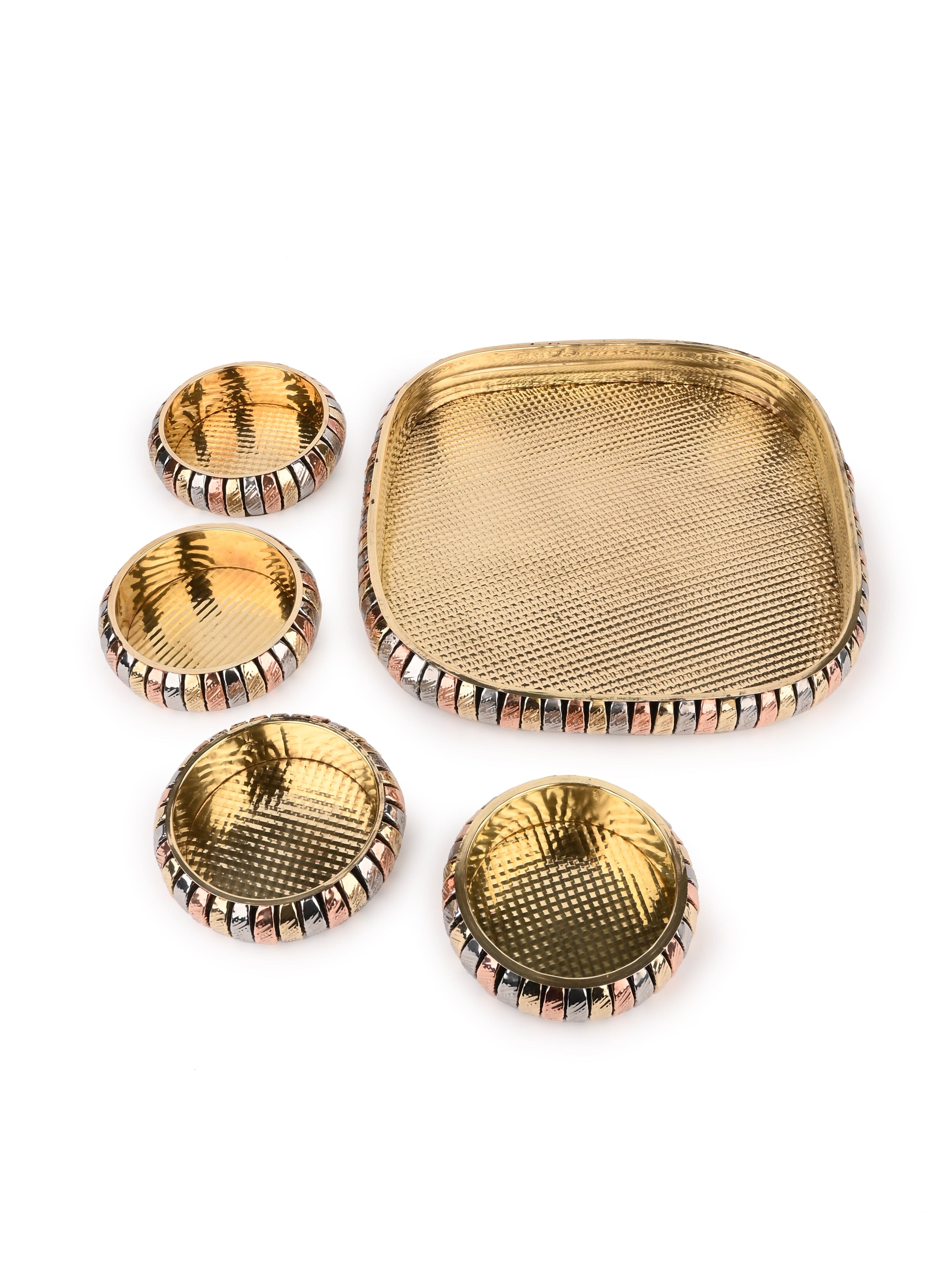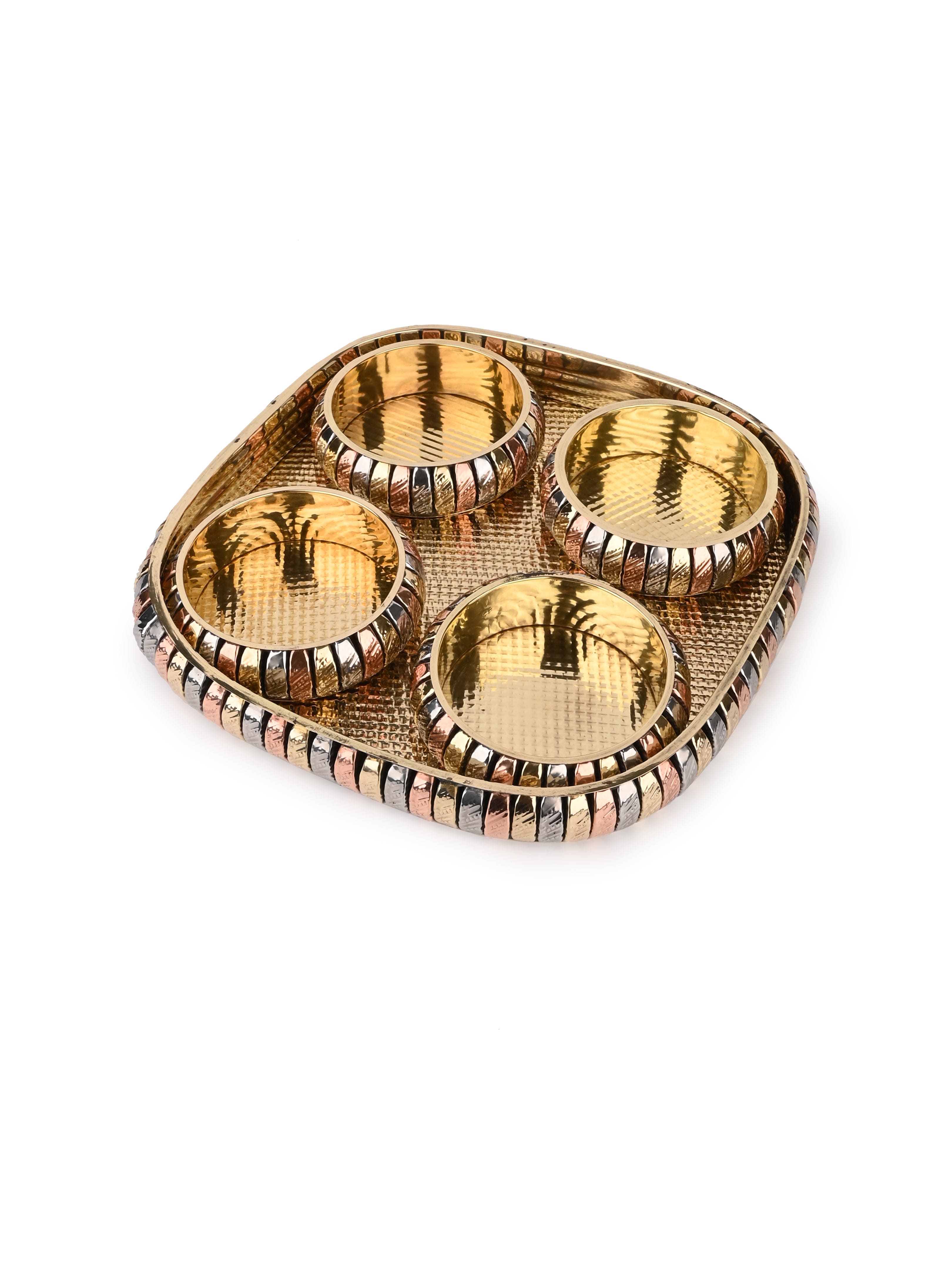 We present this beautiful set of tray and four bowls that comes in brass and copper finish to bring elegance to your dining table with its excellent visual appeal. It is mainly used for dry fruits but you can use it as a multi purpose storage unit also. Don't by shy to flaunt the set in front of your guests.