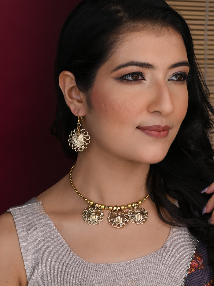 MAURYANA - Dokra craft hasuli chokar necklace set with earrings - adjustable length