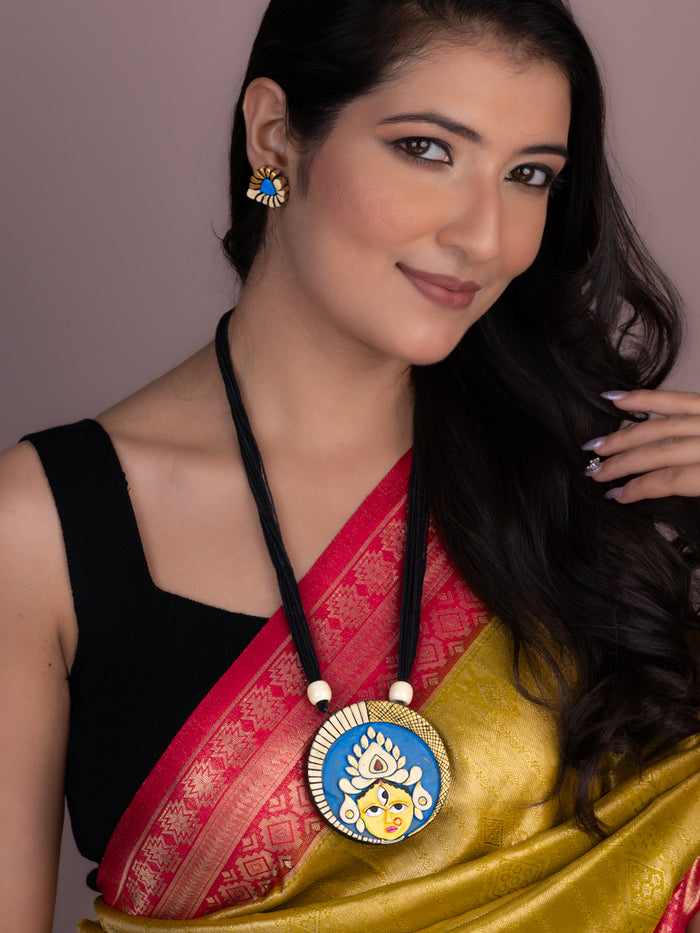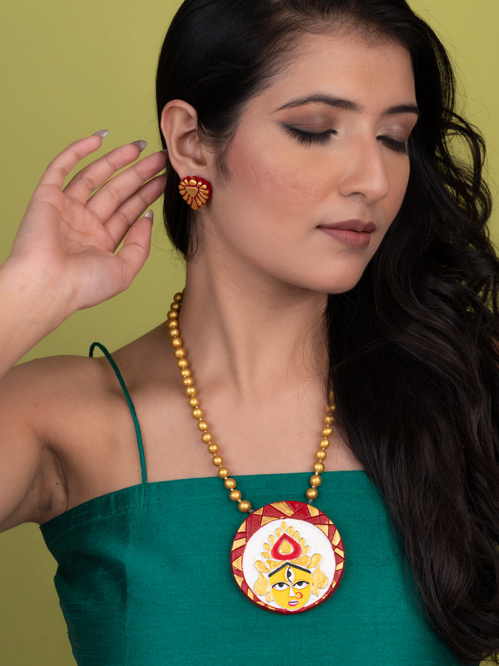 MAURYANA - Terracotta Durga mata face design pendant necklace set with earrings - Assorted colors - adjustable length