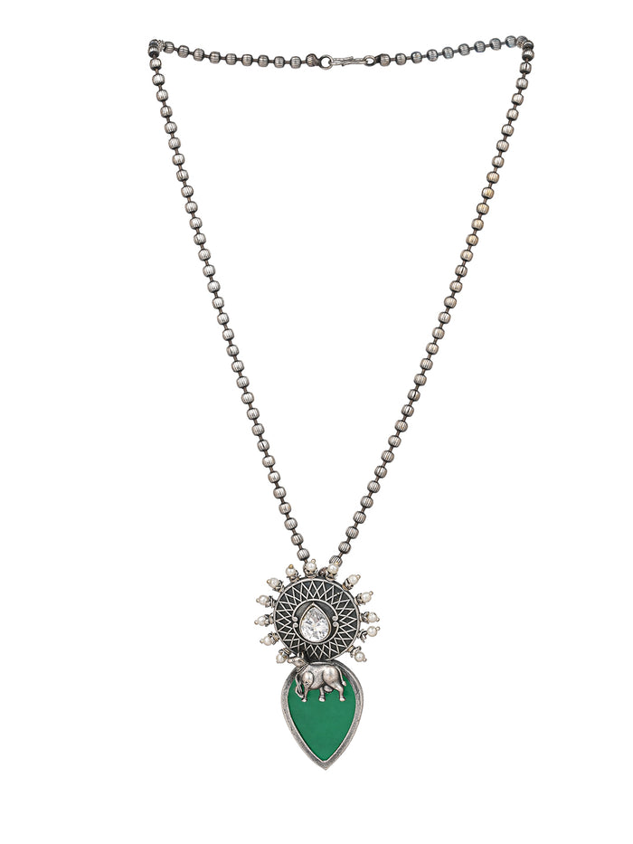 MAURYANA - Oxidised silver with green stone embellished necklace set with earrings - one size