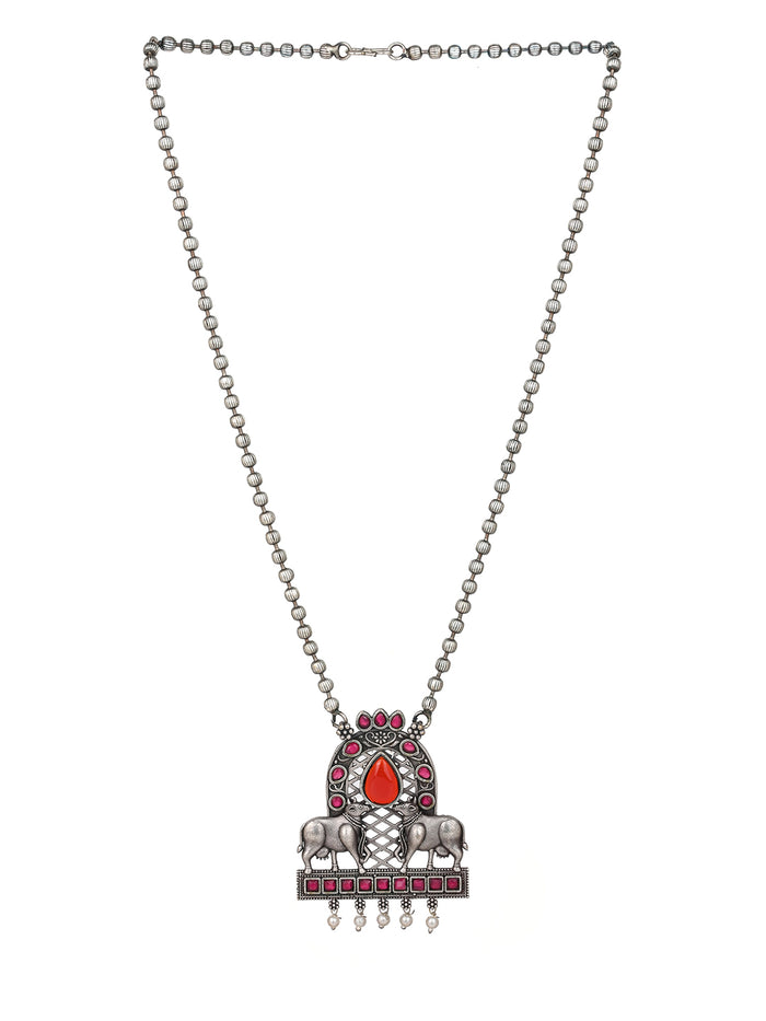 MAURYANA - Oxidised silver pendant necklace set with earrings - adjustable length