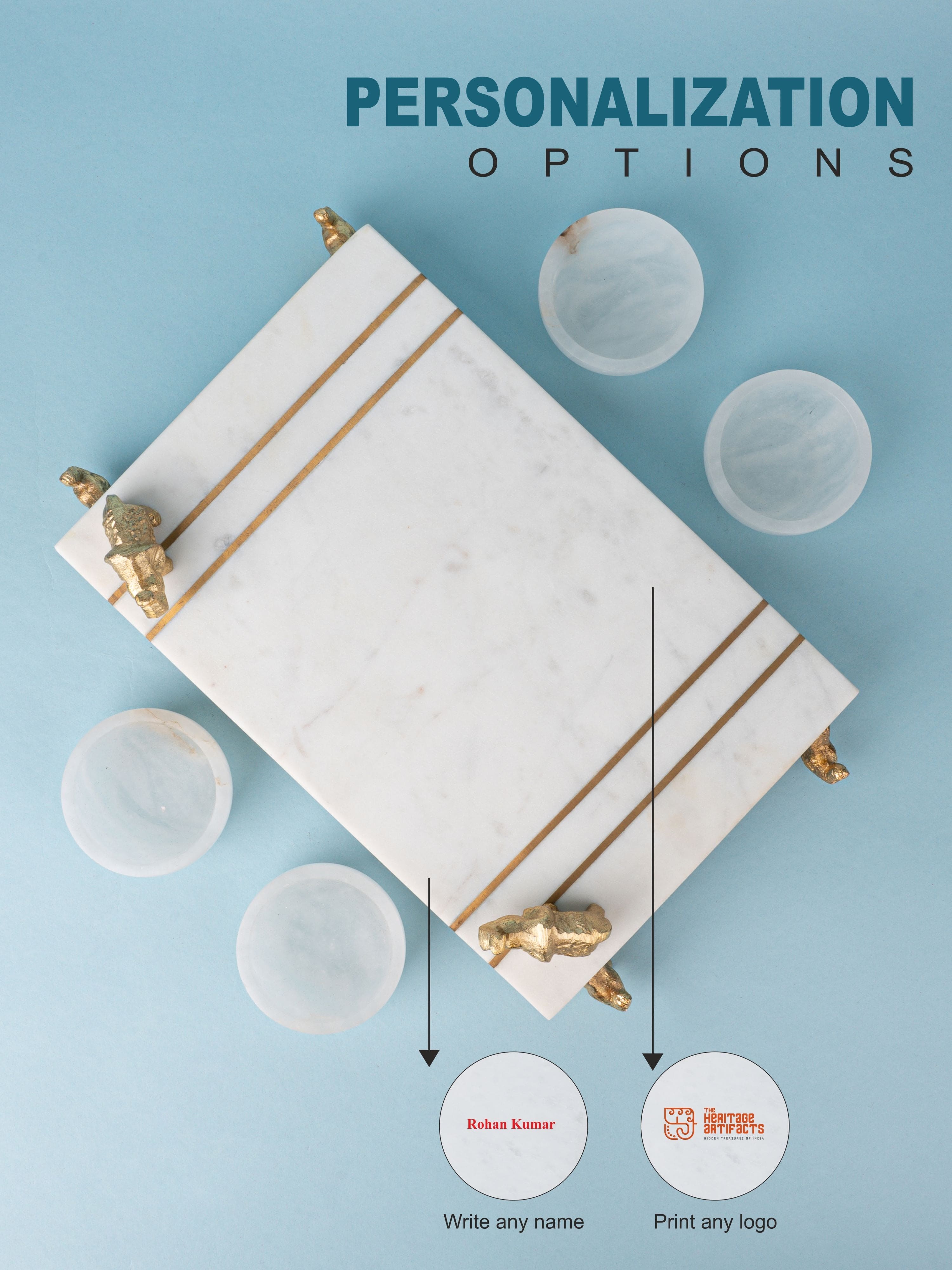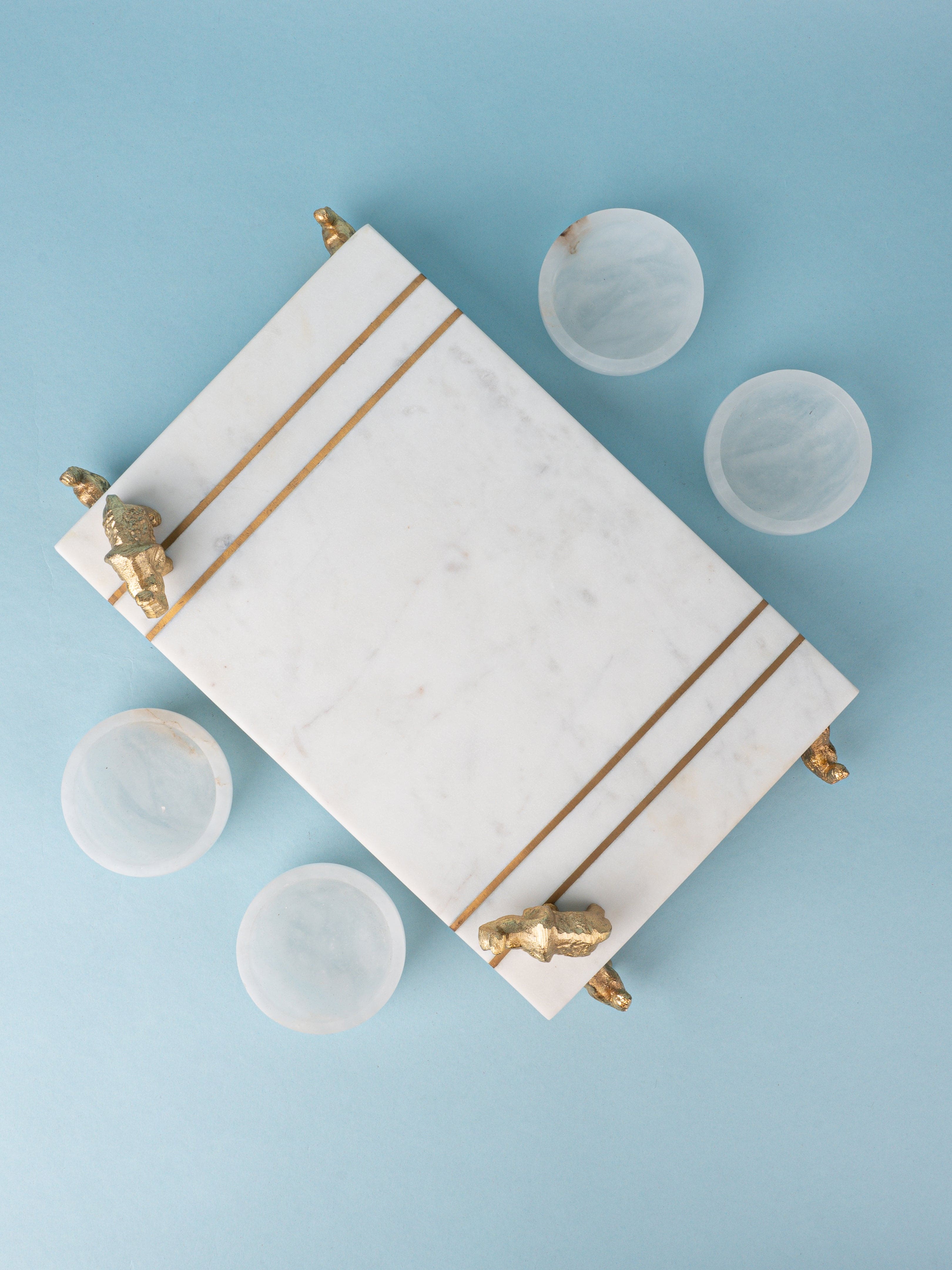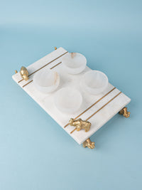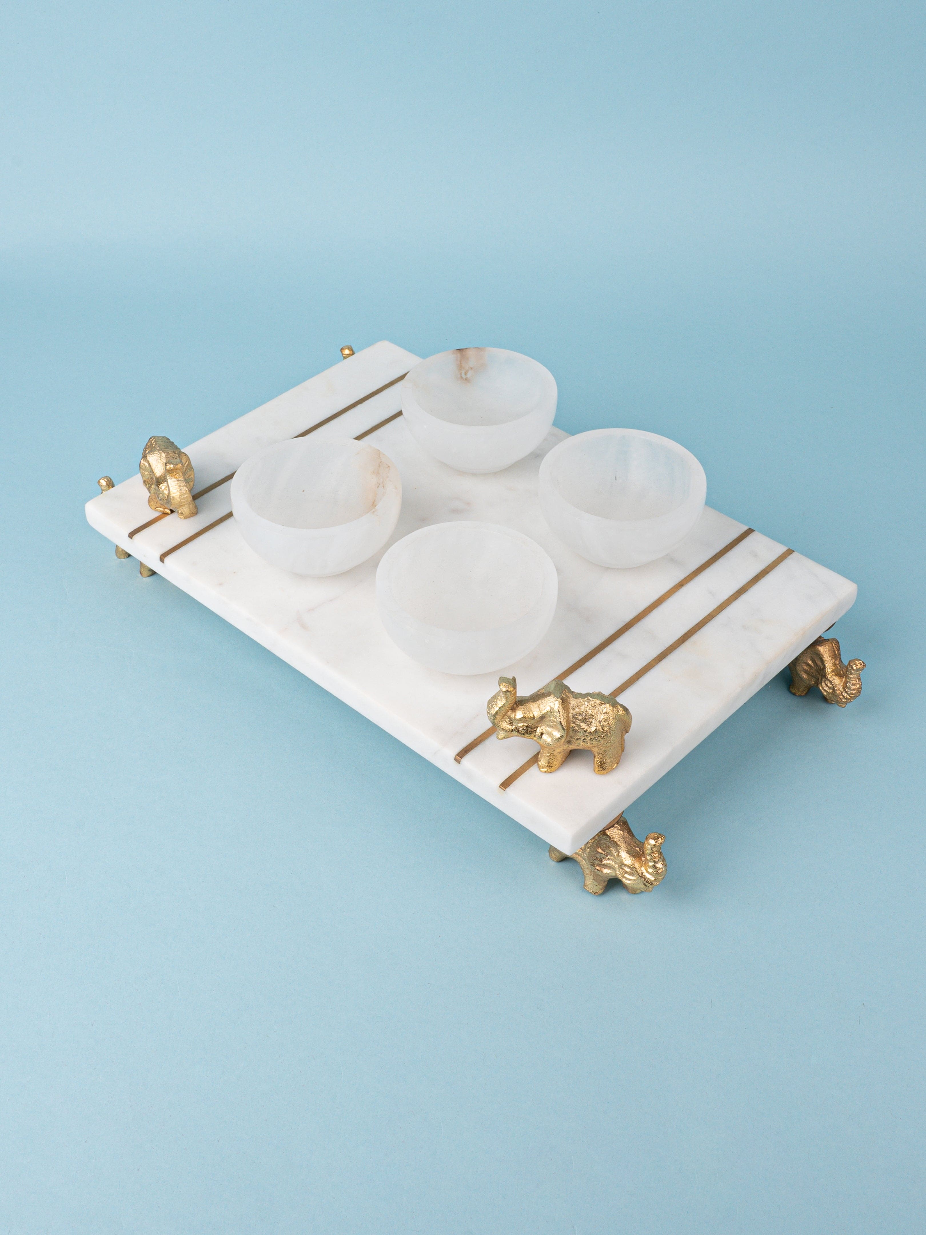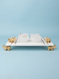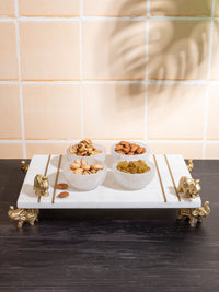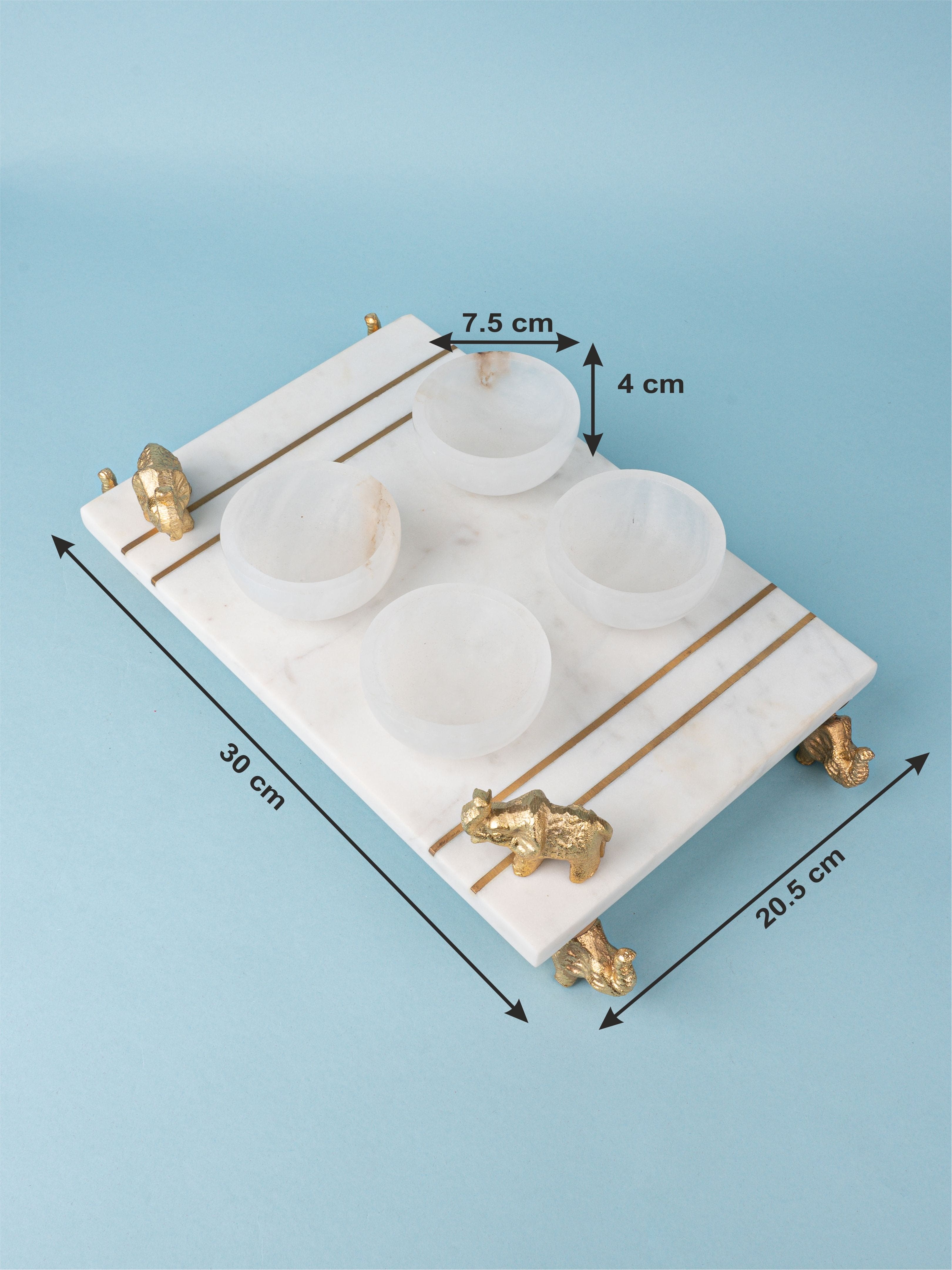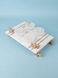 A multipurpose serving set for dry fruits, pickles, snacks, dips, candies and what not. It is perfectly handcrafted of marble with the best quality finish. The stand with metal elephant legs and brass inlay is so attractive that it can alone elevate your dining room decor.