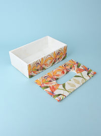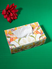 This premium tissue paper box has a floral pattern on white marble so it makes for a great souvenir gift from India. It is sturdy and long lasting and will brighten up your space for years to come. This colorful patterned tissue box is a contemporary take on traditional Indian handicraft. It is both functional and decorative and adds an elegance to your space.