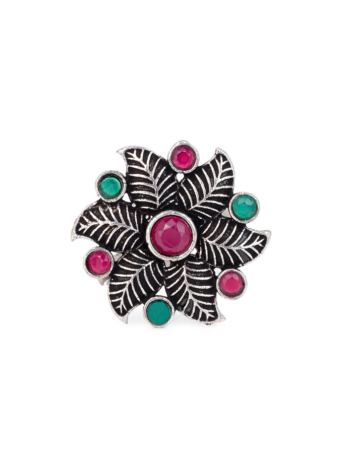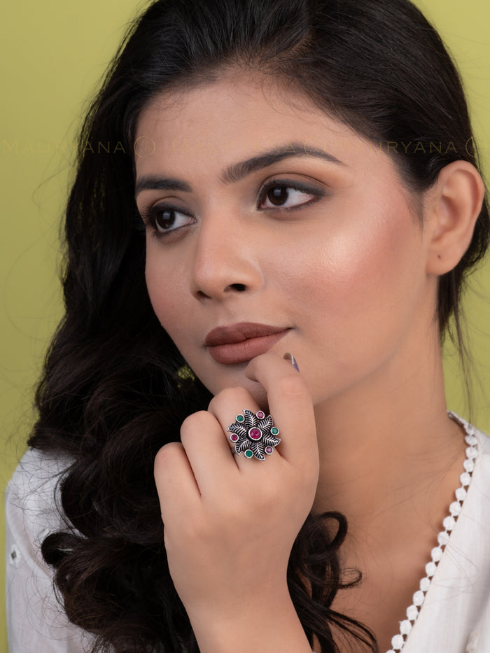 MAURYANA - Oxidised silver flower design ring with red and green stone - adjustable size
