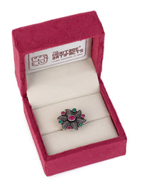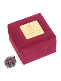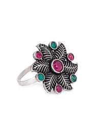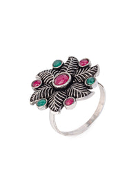 MAURYANA - Oxidised silver flower design ring with red and green stone - adjustable size