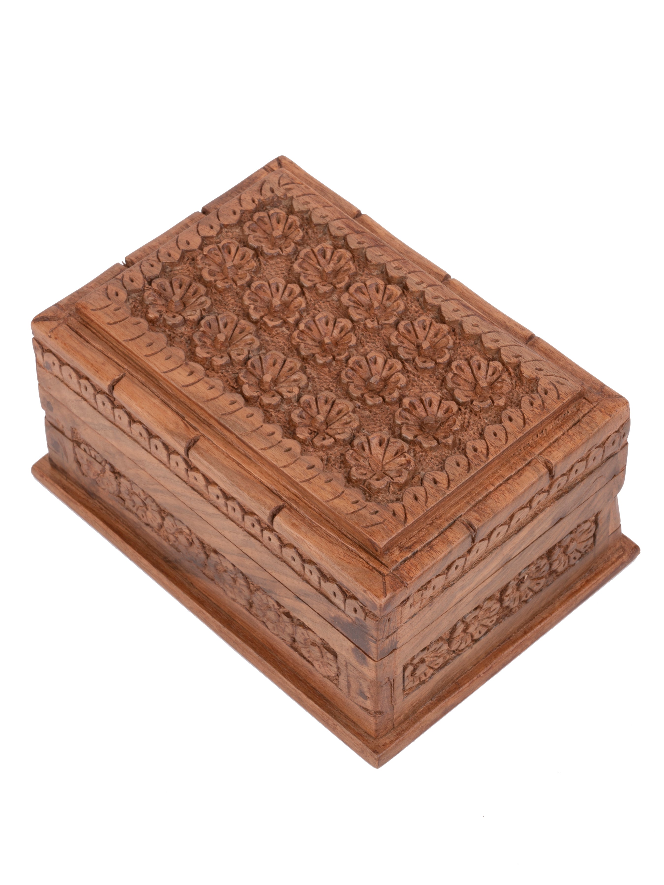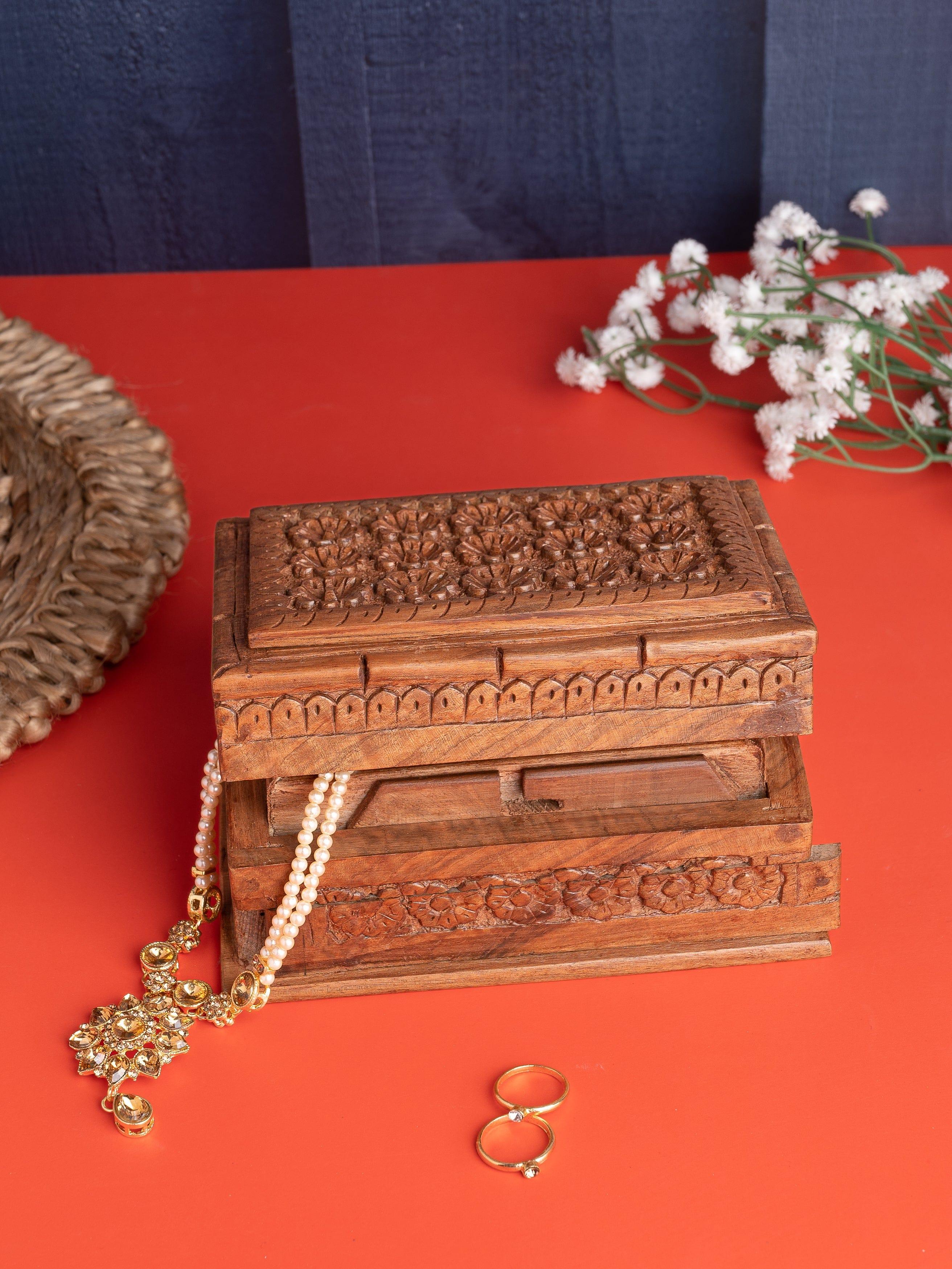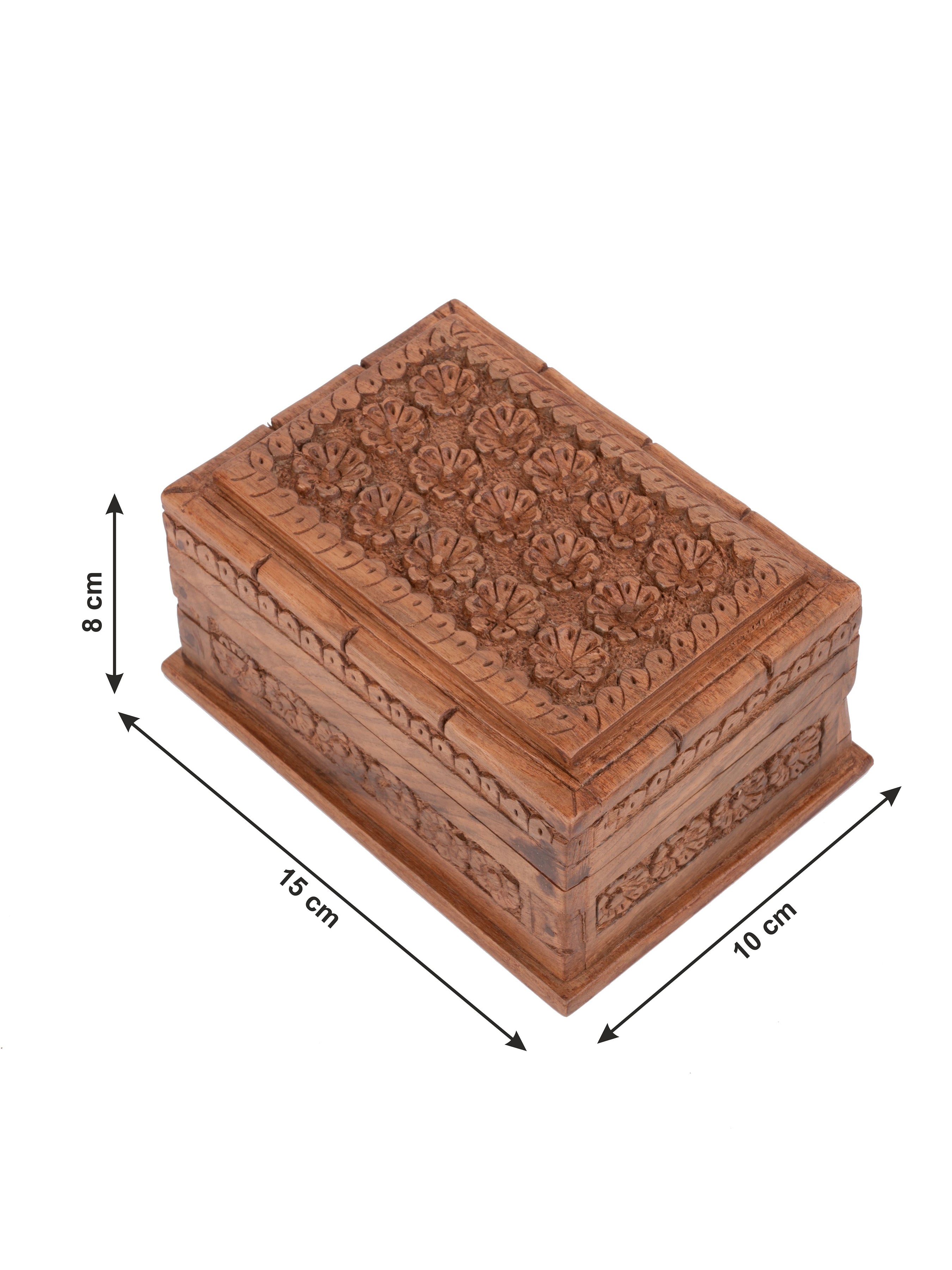 Hand carved by Kashmiri artisans with great care detail, this beautifully made walnut wood box can be used for storing any item of your choice. It is most commonly used to keep jewellery. Made with expert craftsmanship, this box is known for its special feature - a hidden lock! There is a panel on the front side of the box which slides and the box opens.