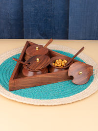 Elevate your dining experience with this beautifully crafted wooden serving jar set with spoon & tray, designed to elegantly present condiments, mouth fresheners, or mukhwas. This set includes 3 jars with spoon and lid in a stylish triangular tray, all meticulously crafted from high-quality sheesham wood.