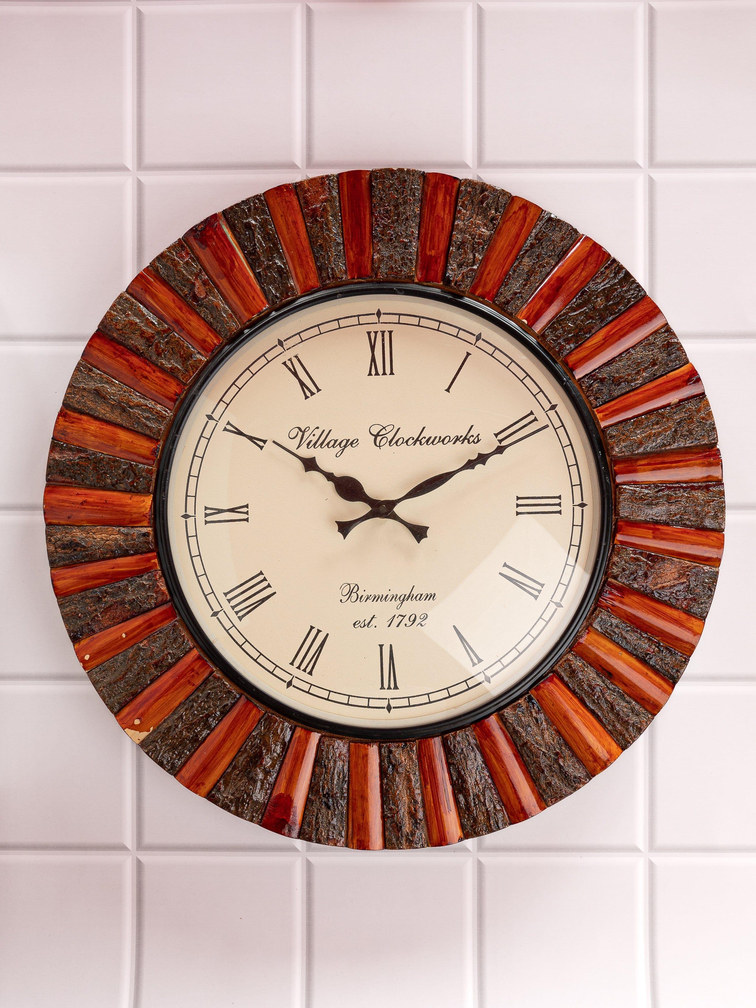 Red and Black solid wood analog wall clock by artisans of Jodhpur. Let your walls reflect the Indian side of you with ethnic clocks from our range. These clocks have an interesting appeal with beautifully carved bodies that will look just right in your home. The clock has 17 inches external and 11 inches internal diameter, it is quite heavy so please handle with care.