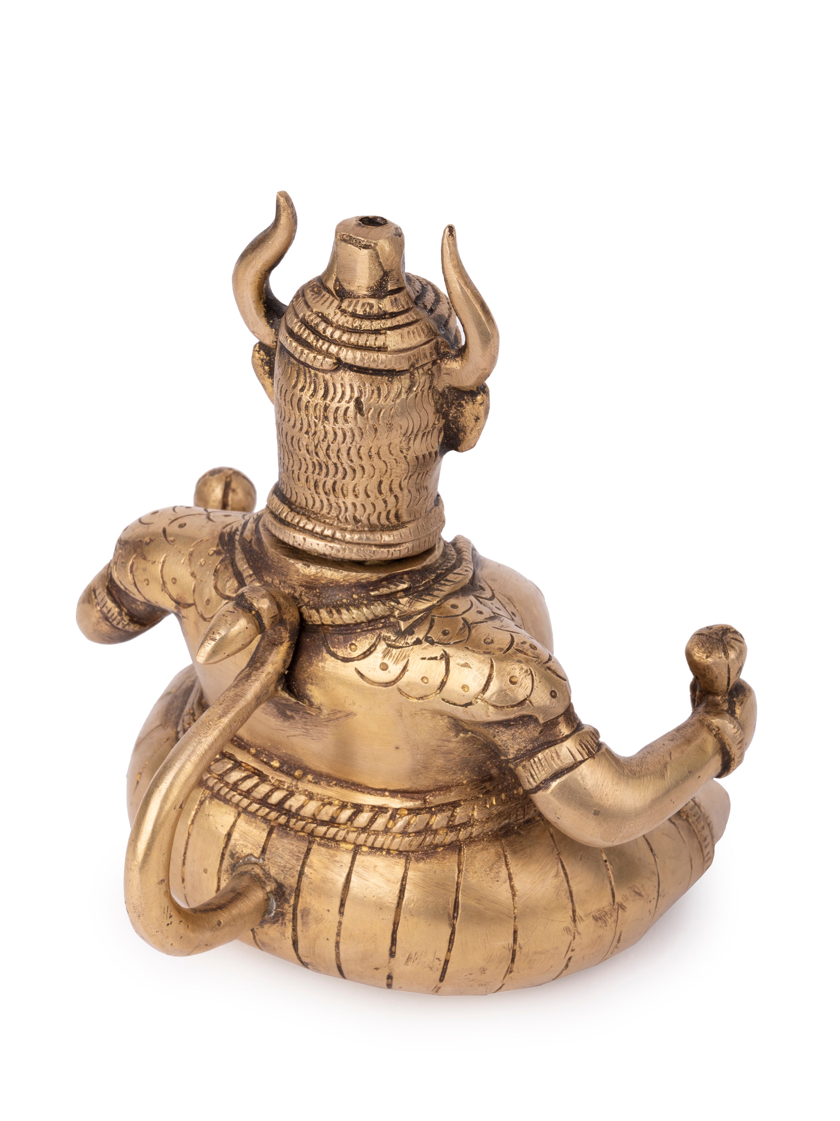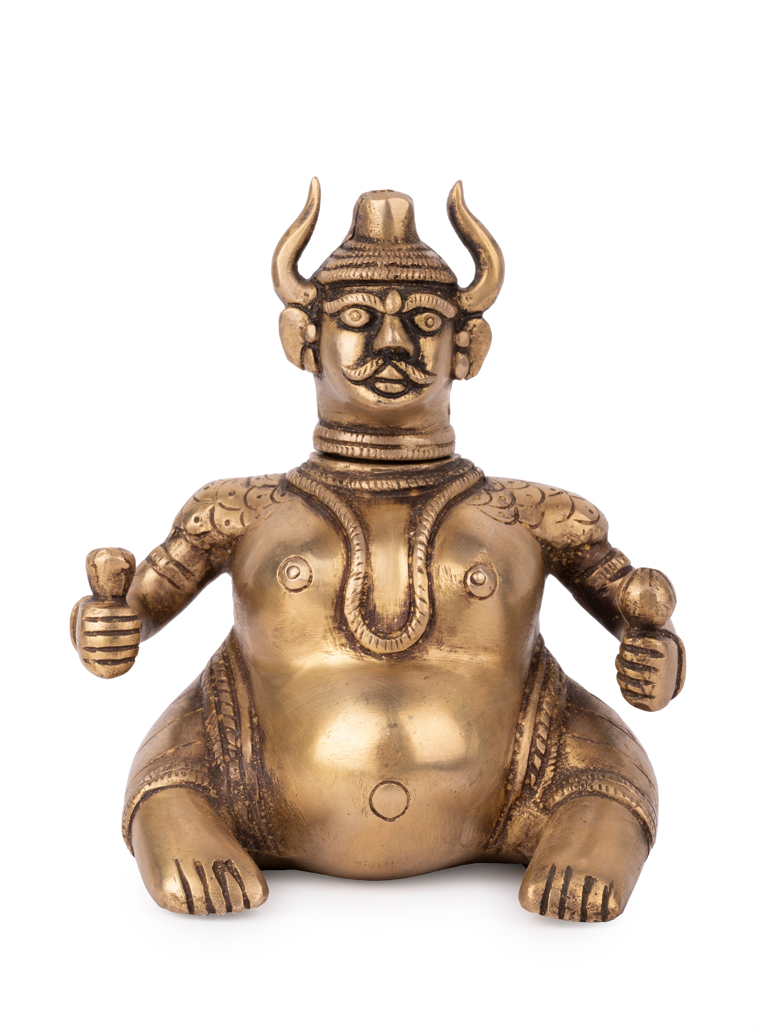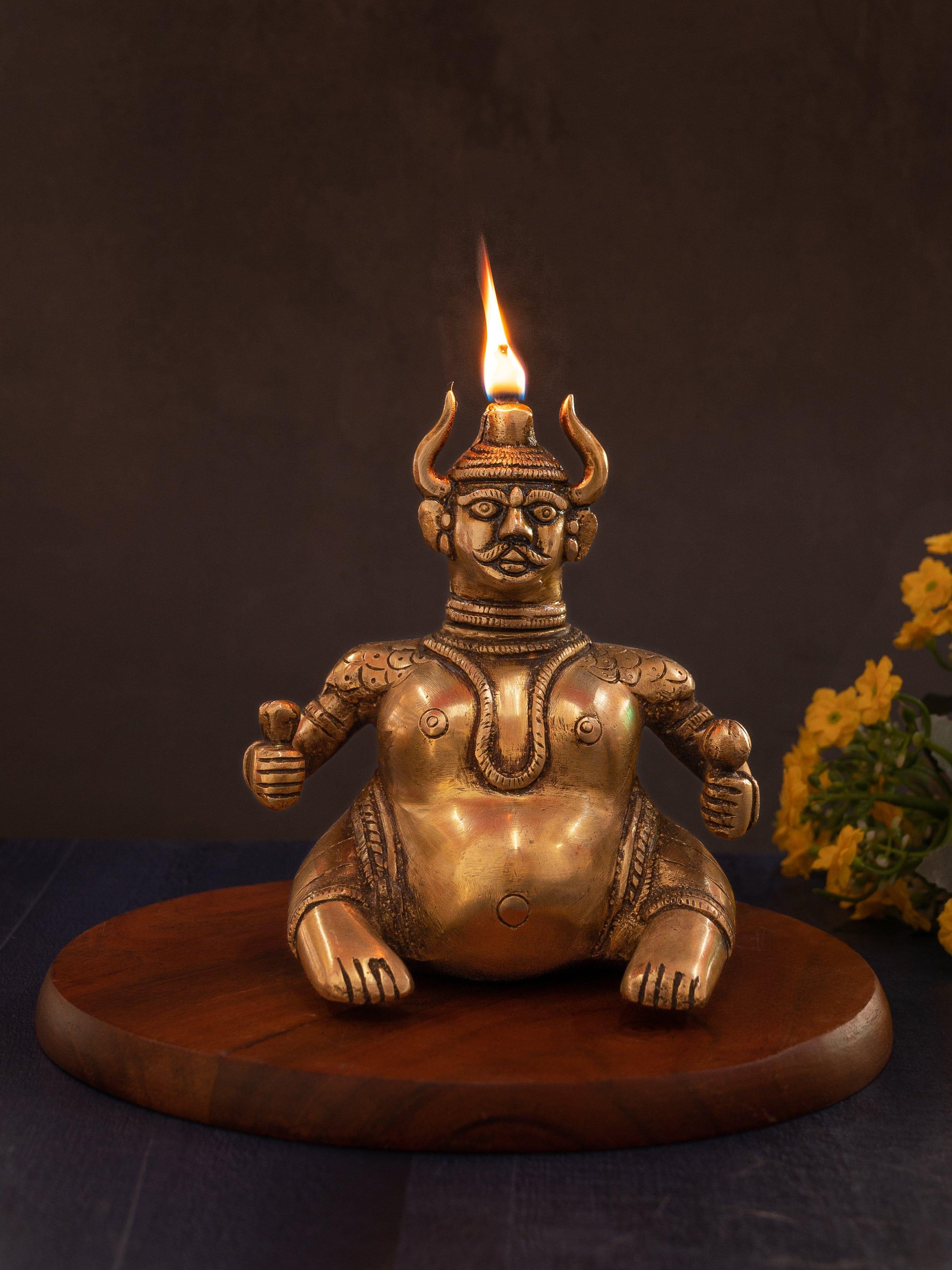 This is a unique figurine of a man with a typical head gear made of brass with antique finish. The head is detachable and inside it, is a full container for filling oil, whereas on top of the head there is provision through which you can put a wick and finally it becomes a burning lamp when you light up the wick. If you don't want to use it as a lamp, it becomes a simple decor piece for your living room or any table top.