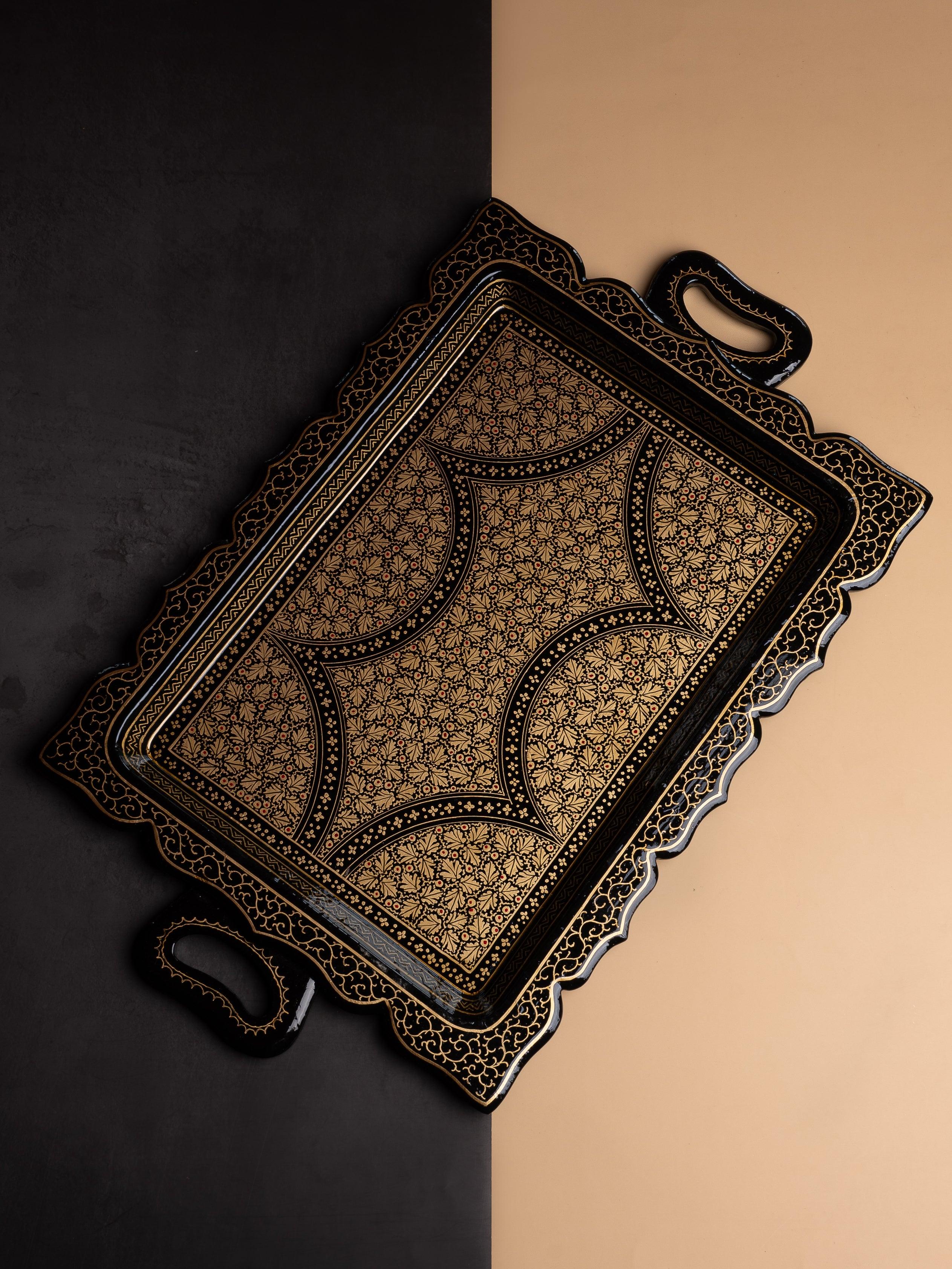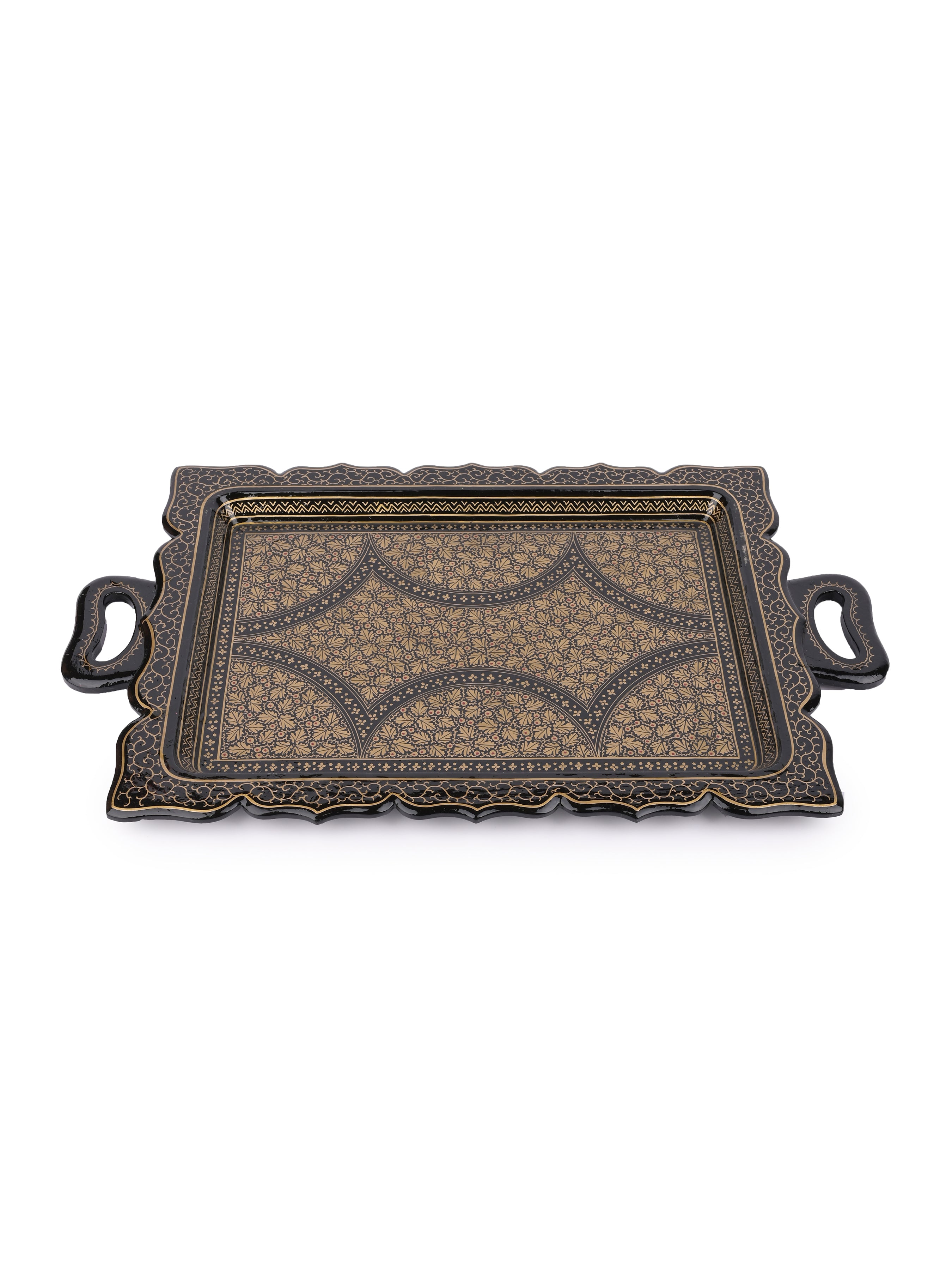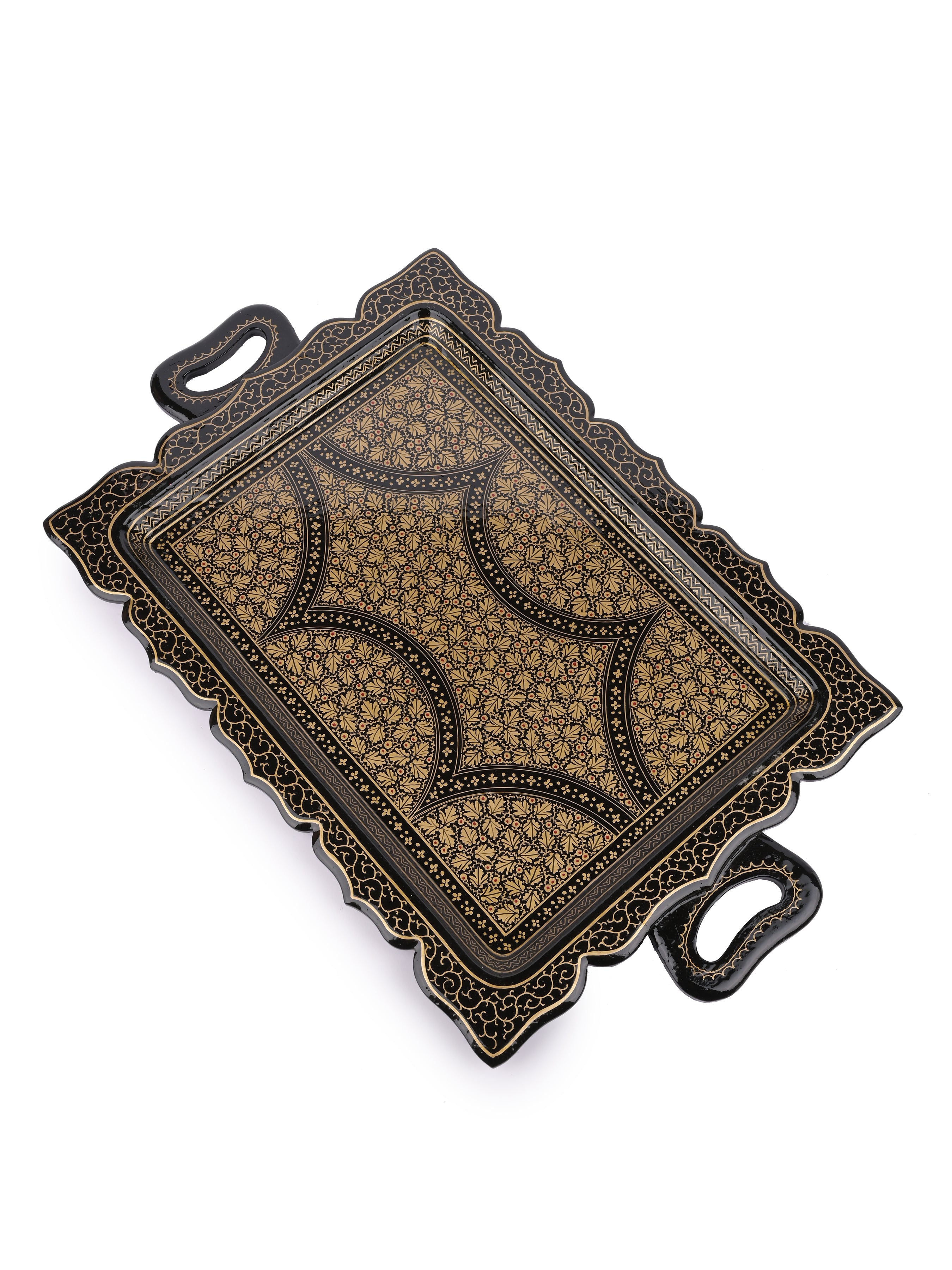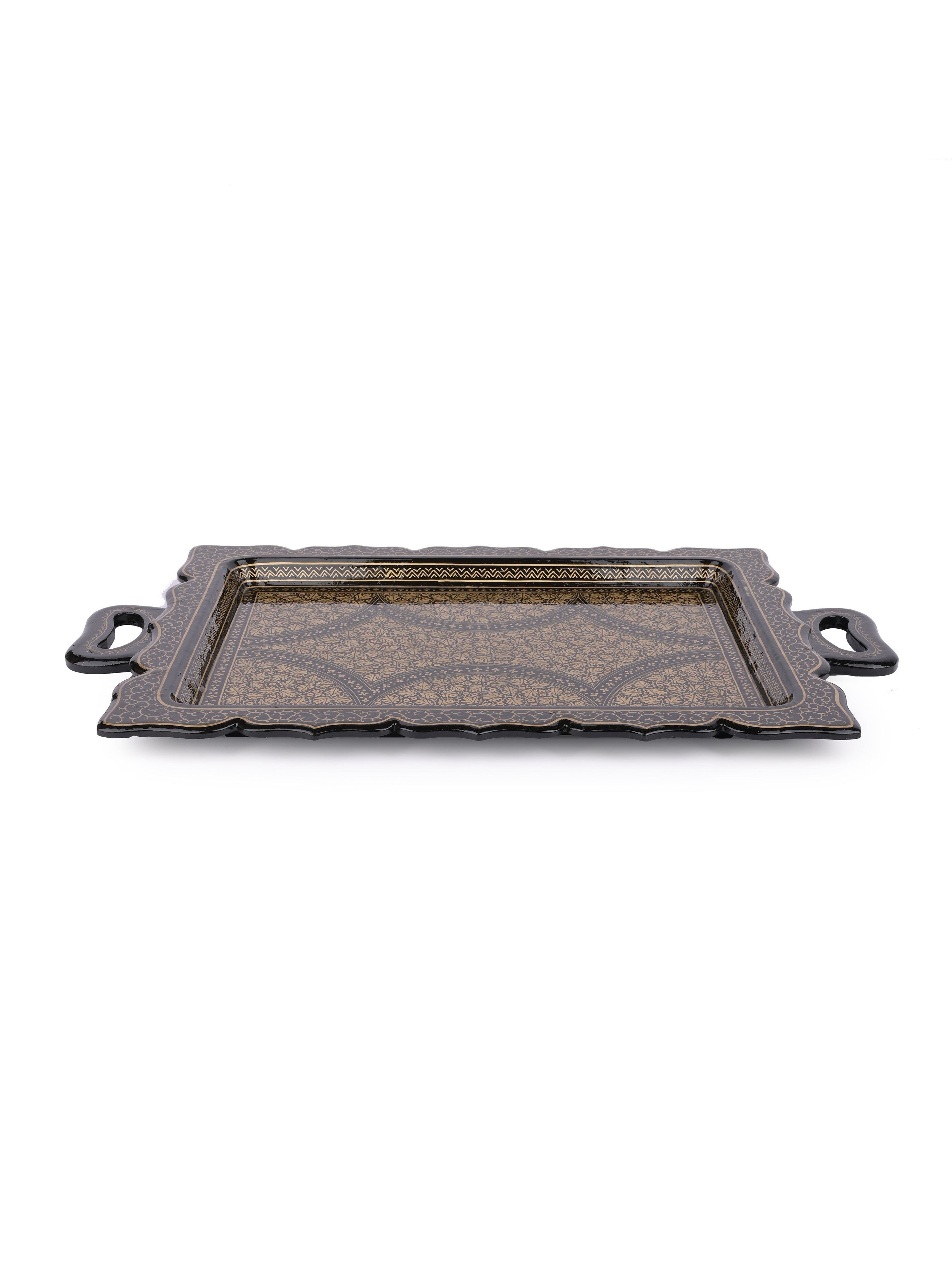 This vibrant multicolored rectangular tray is beautifully hand painted with traditional motifs in Kashmiri style. It is a unique home artifact, an ideal gift for any occasion. It is a classy way to serve your guests or can be used on your dressing table for nick-knack stuff. Handles on the 2 sides gives you a proper grip to move it from one place to another.