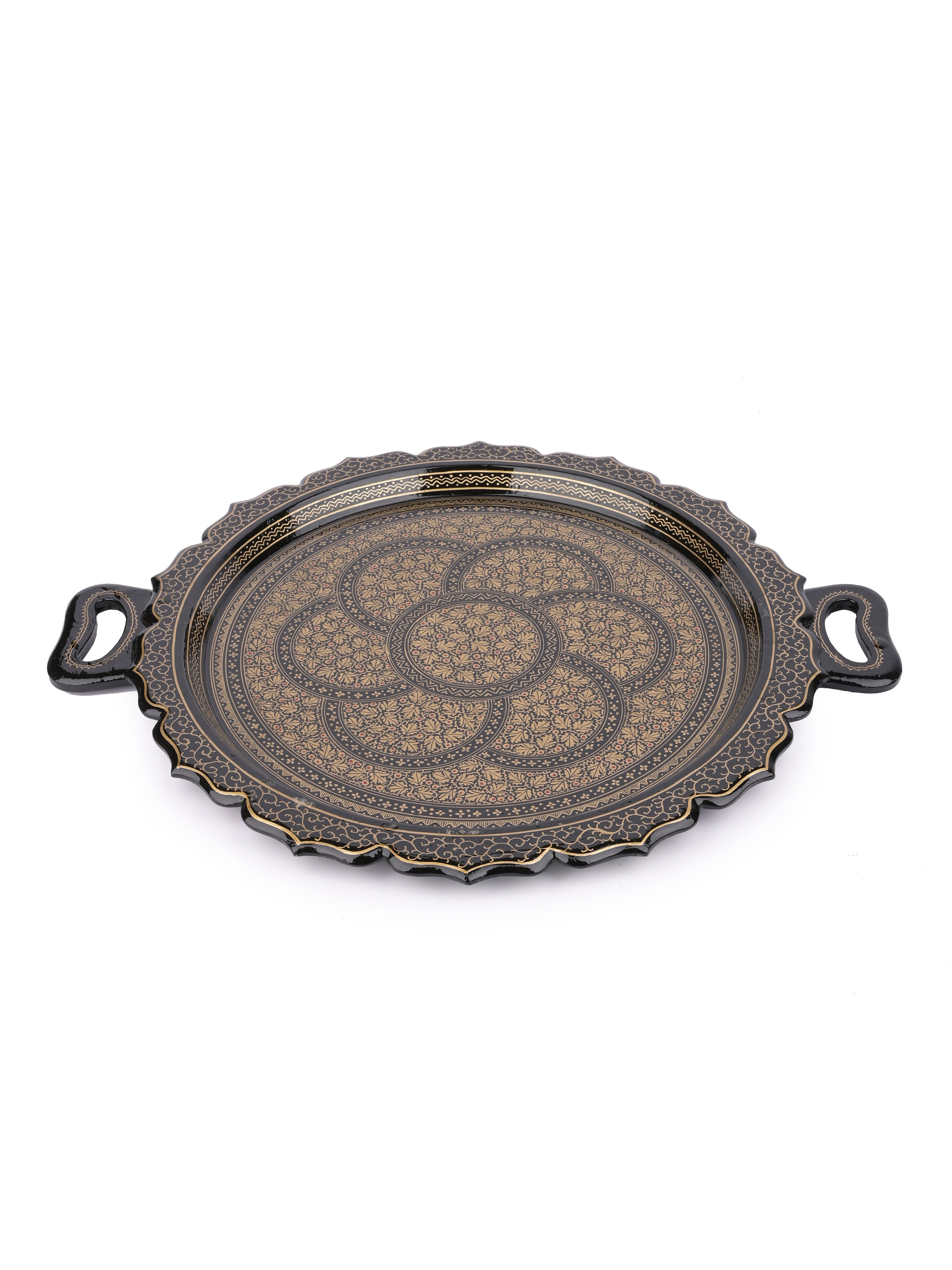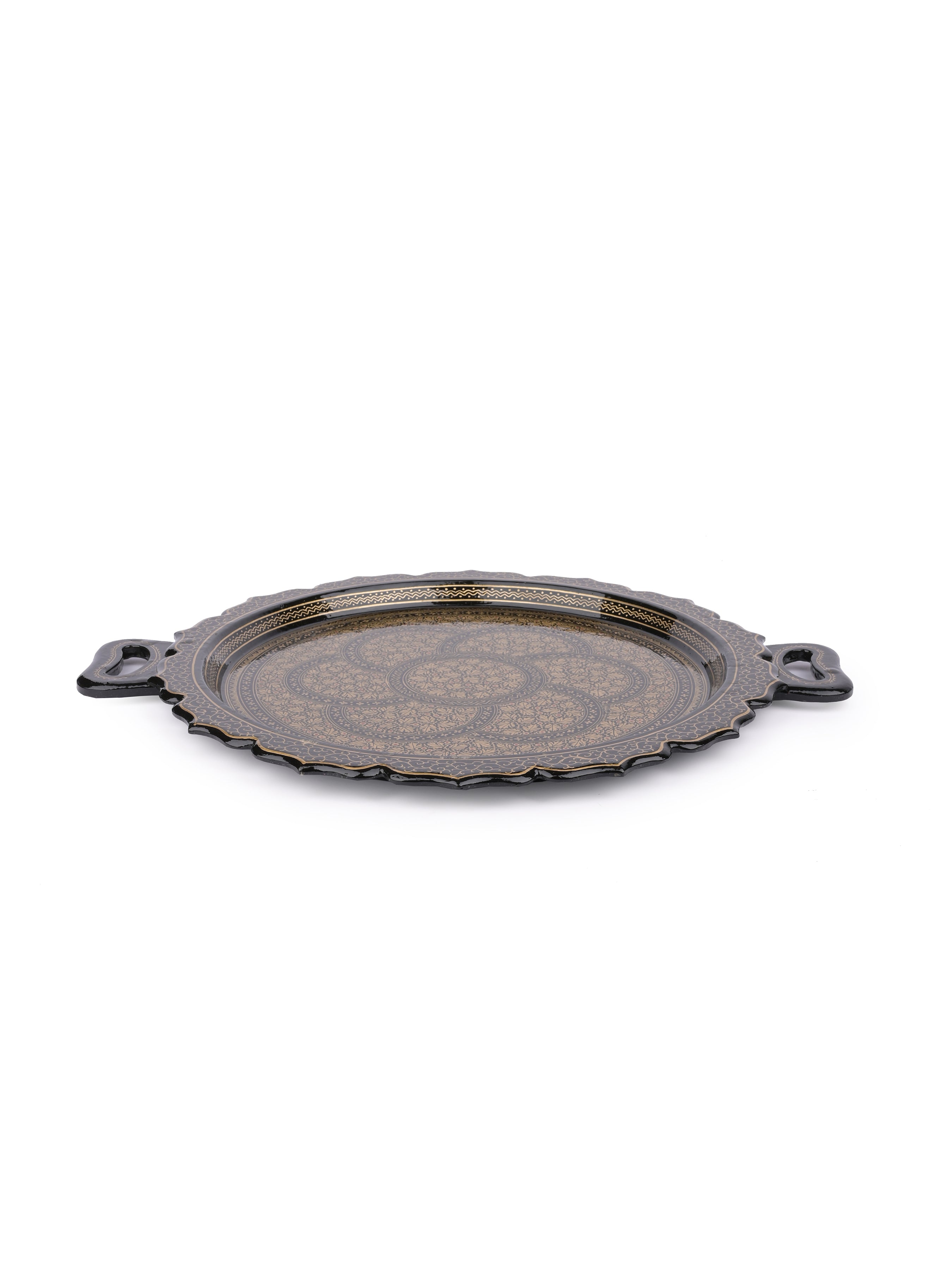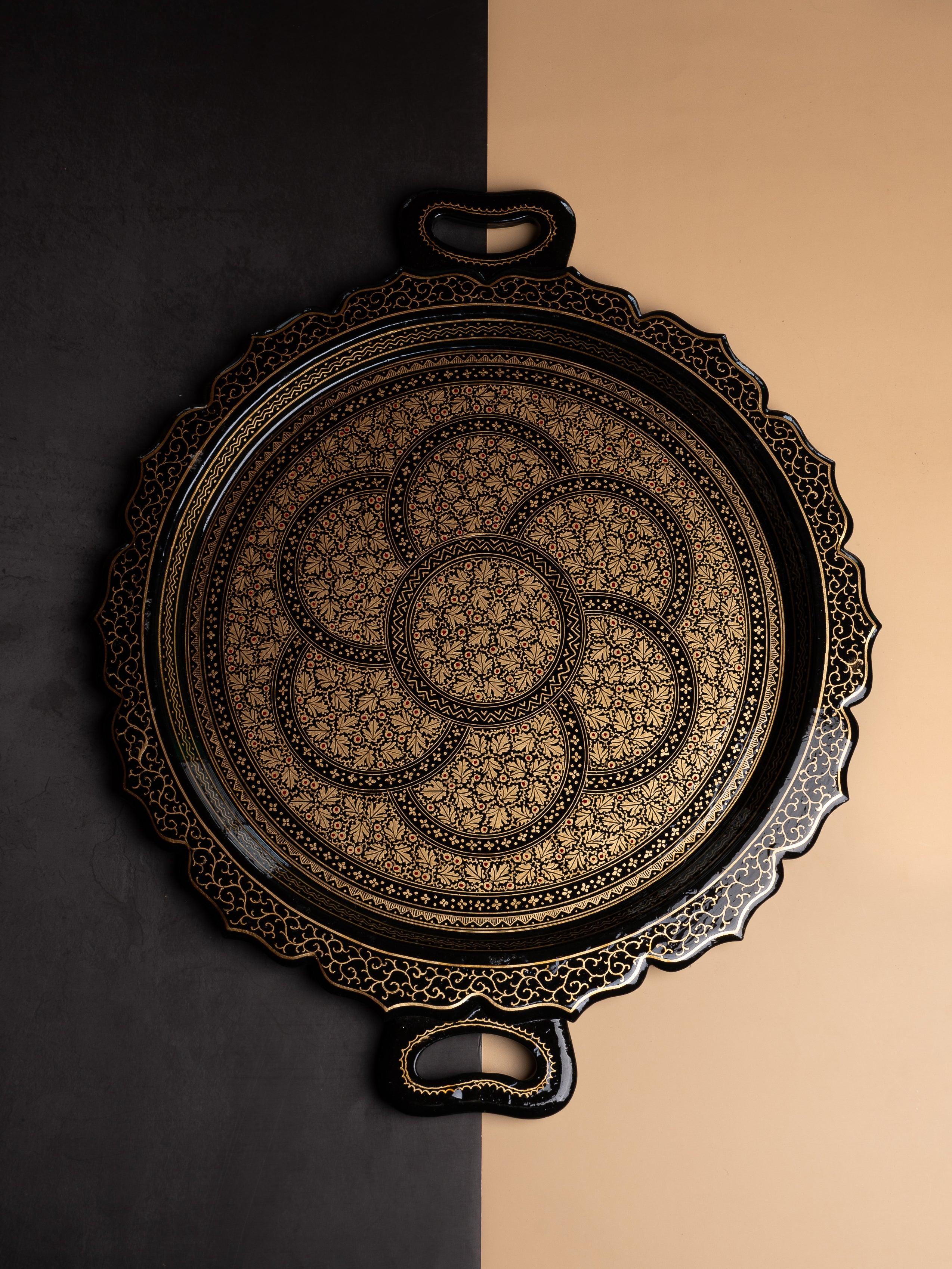 Paper Mache, Black and Gold Round Decorative Serving Tray with Handle
